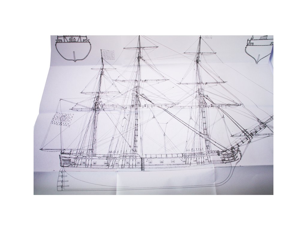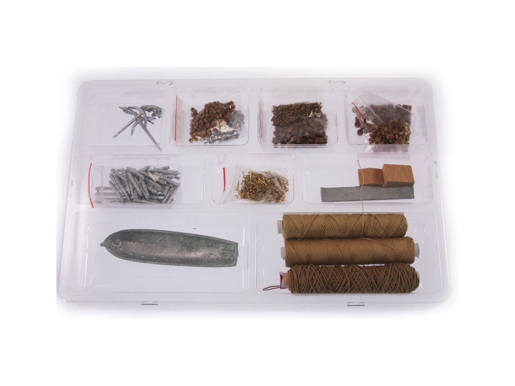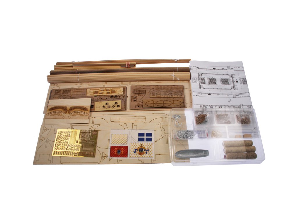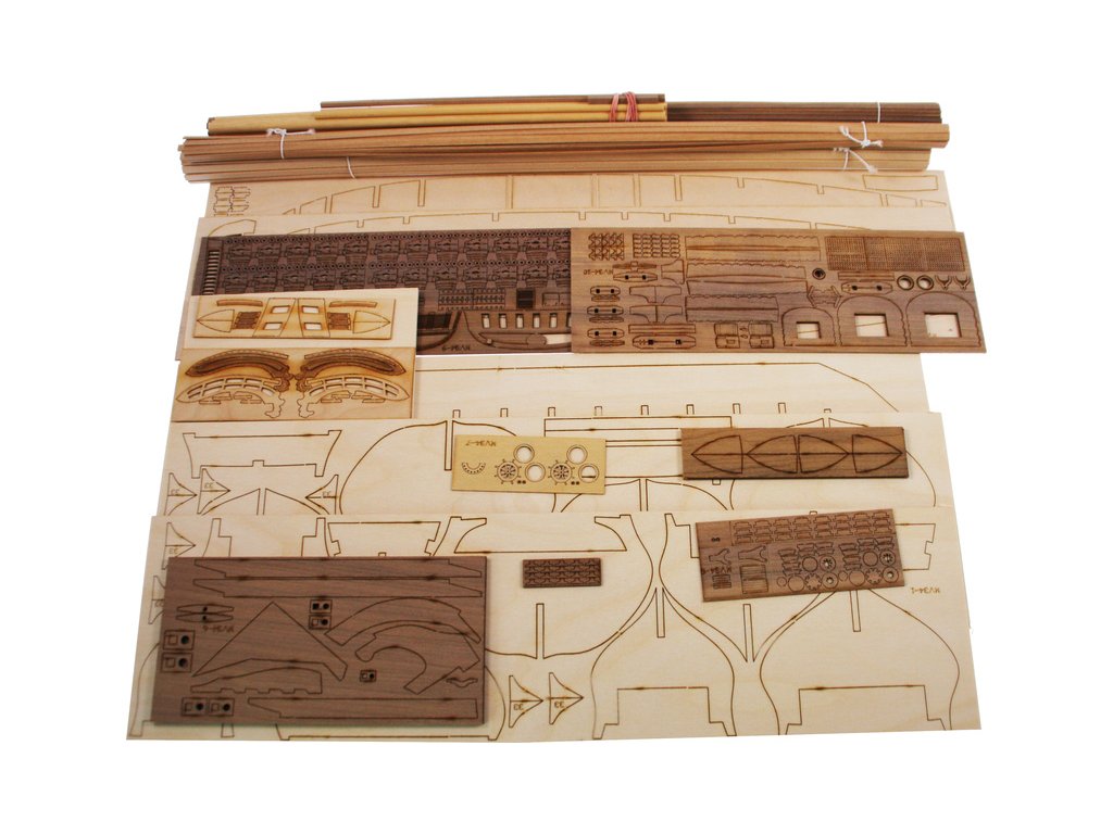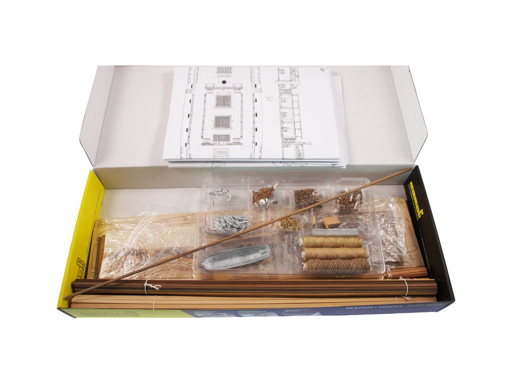 Balení obsahuje sadu překližkových dílů, sadu dřevěných lišt o různém průřezu, blistr s drobnými díly, díly z mosazi, sadu výkresů a vícejazyčný manuál.