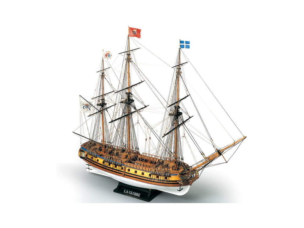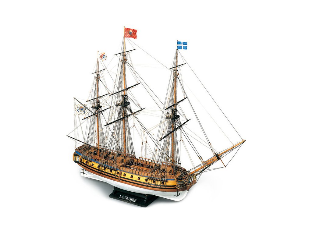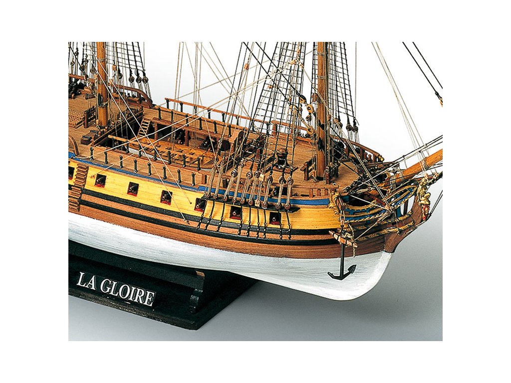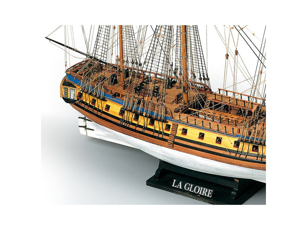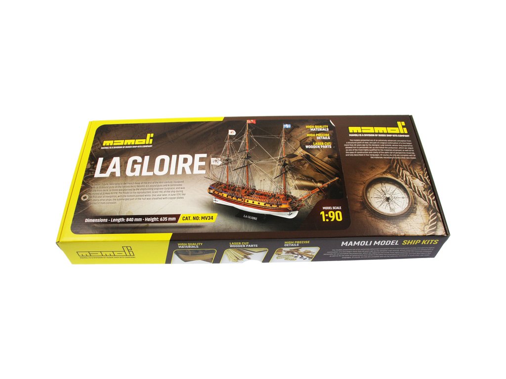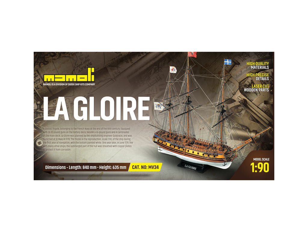 Stavebnice neplovoucího modelu MAMOLI La Gloire v měřítku 1:90 z roku 1778. Loď patřila francouzskému námořnictvu a byla bohatě vybavena 26 kanony. Klasická fregata s bohatým zdobením a četnými detaily. V balení jsou dřevěné díly, lišty a množství kování, lanoví, plány atd.