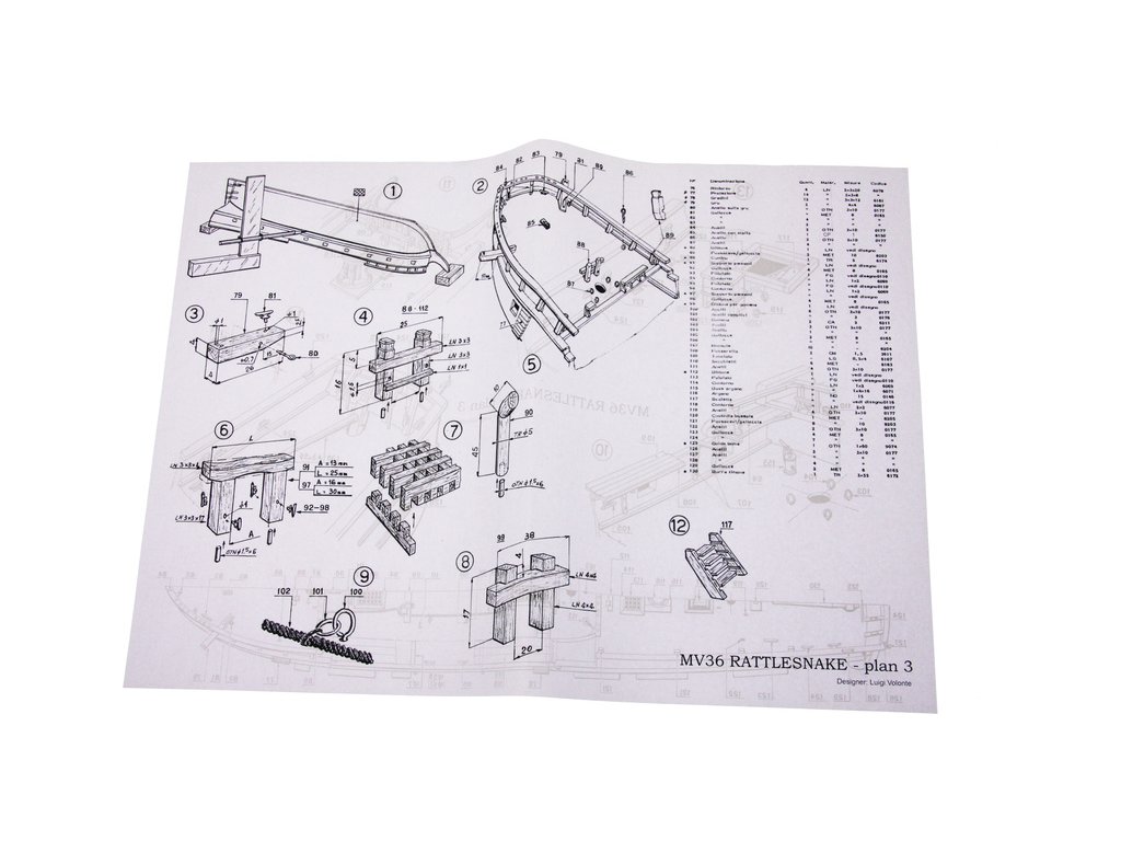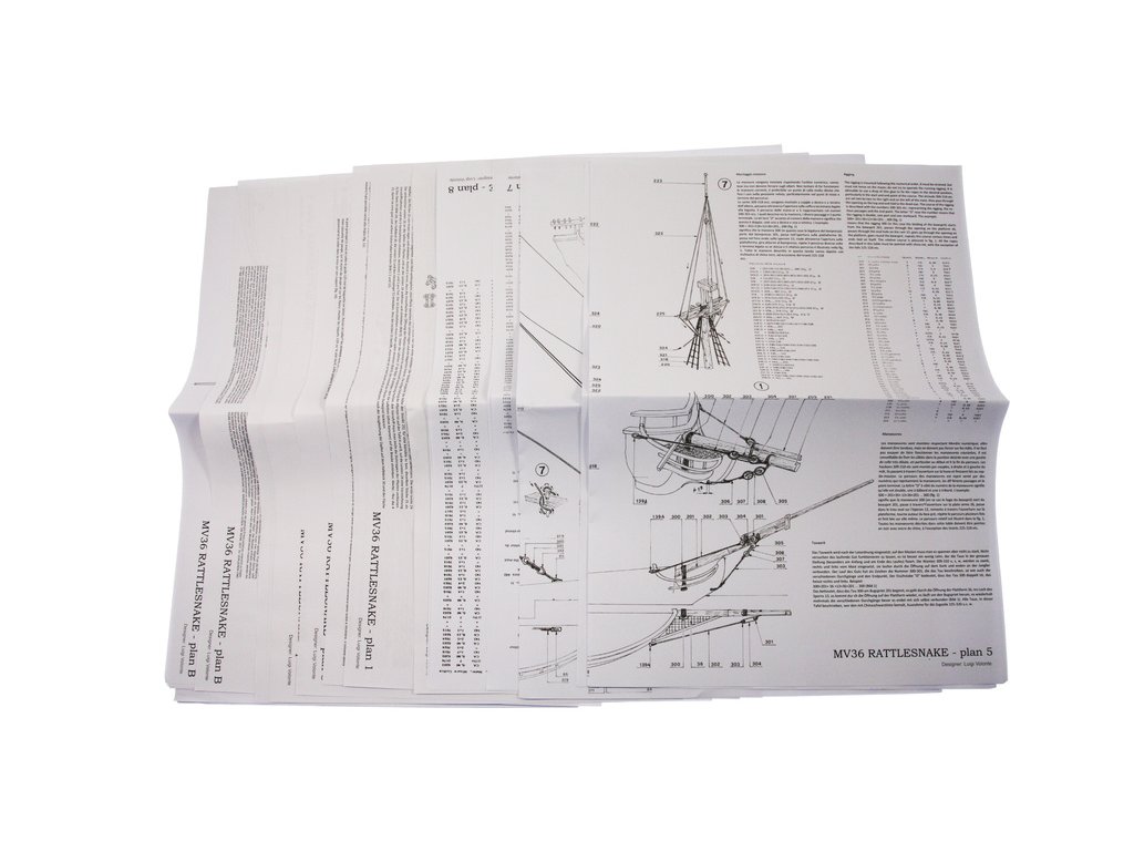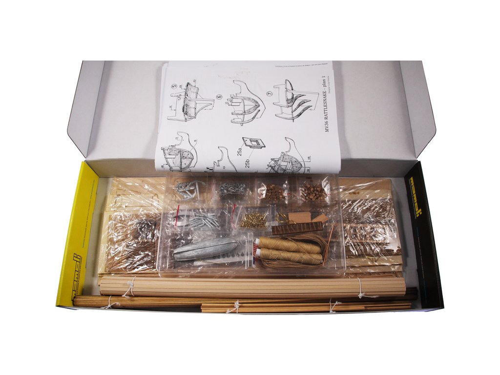 Součástí balení stavebnice statického modelu lodi MAMOLI Rattlesnake 1:64, je kompletní sada výkresů modelu 1:1, manuál, sada překližkových CNC výřezů, sada dřevěných lišt, výpalky z mosazného plechu, odlitek záchranného člunu, ozdobné kování, sada odlitků děl, sada kování, kladky, nitě na lanoví, apod.