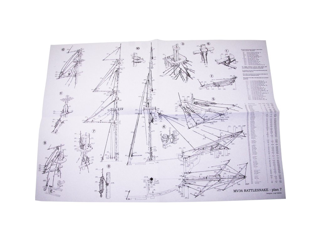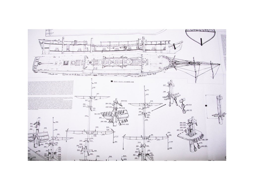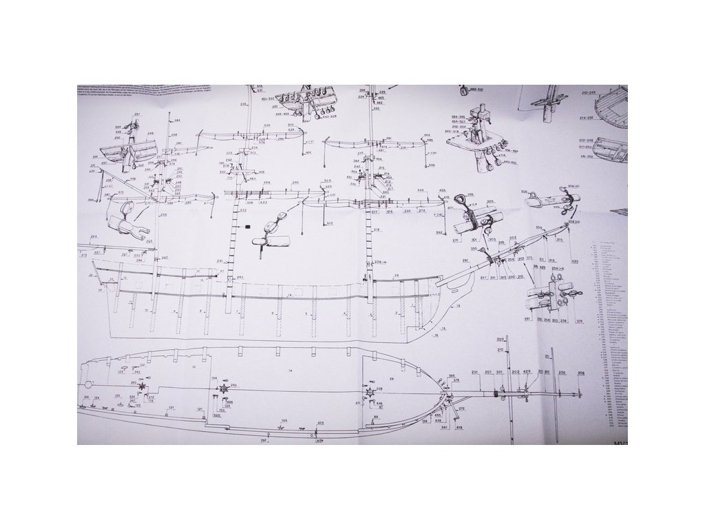 Set obsahuje kompletní sadu výkresové dokumentace modelu v měřítku 1:1 s obrázky jednotlivých detailů. Na výkrese jsou v měřítku nakresleny montážní sestavy, jejich kompletace a to včetně stěžňů a ráhen a způsob vázání lanoví. Vícejazyčný postup stavby rámcově upravuje logické sestavení jednotlivých komponentů.
