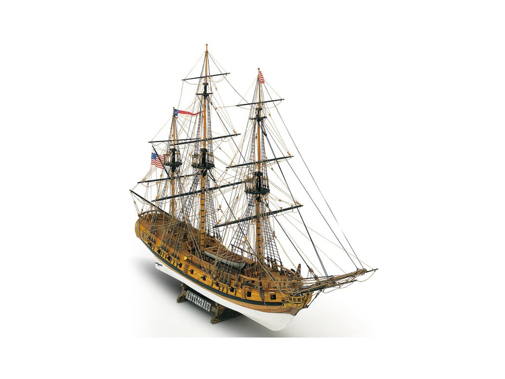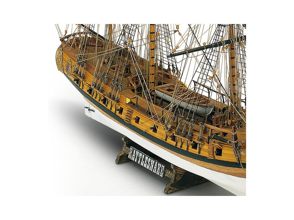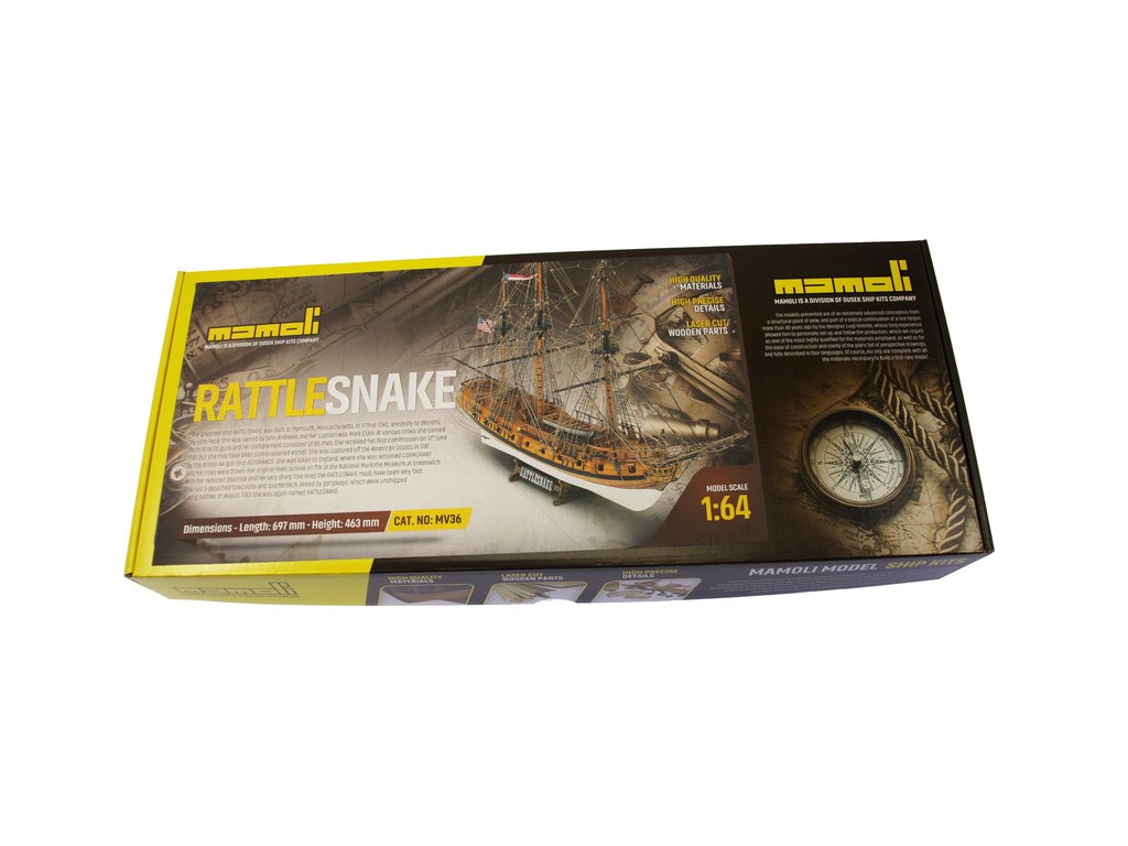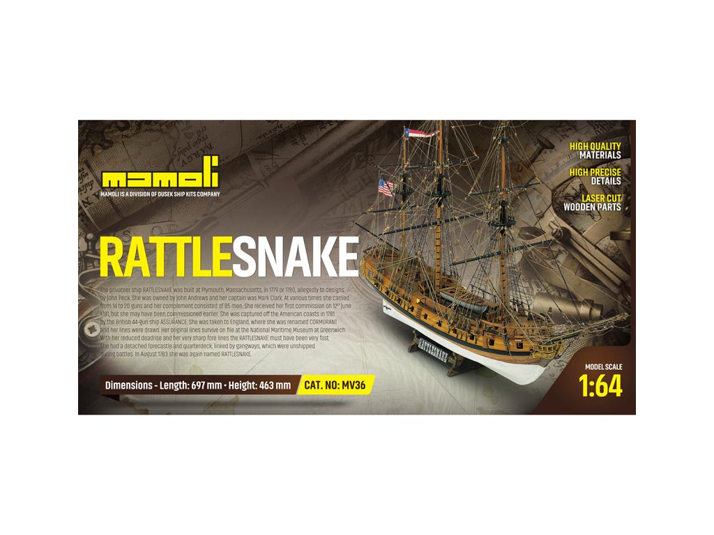 Stavebnice neplovoucího modelu MAMOLI Rattlesnake v měřítku 1:64 z roku 1779. Loď byla vyrobena v Plymouthu, Massachusetts a byla bohatě vybavena až 20 kanony, posádka se skládala z 85 mužů. Loď byla rychlá, měla štíhlý trup se špičatou přídí. V balení jsou dřevěné díly, lišty a množství kování, lanoví, plány atd.