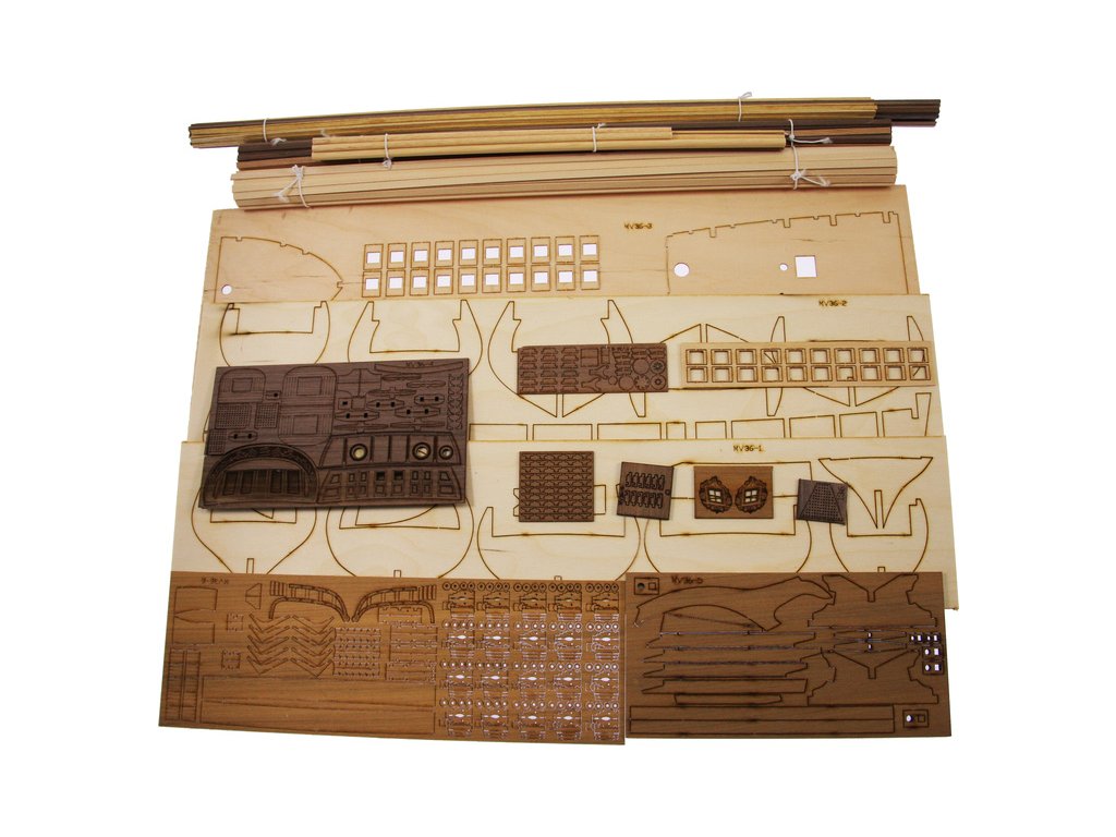 Po otevření víka krabice naleznete dřevěné díly modelu z překližky, sadu lišt, drobné součásti uzavřené v sáčcích, sadu výkresů a manuál.