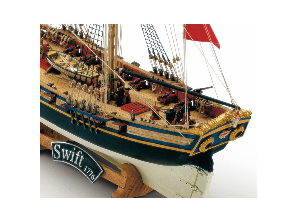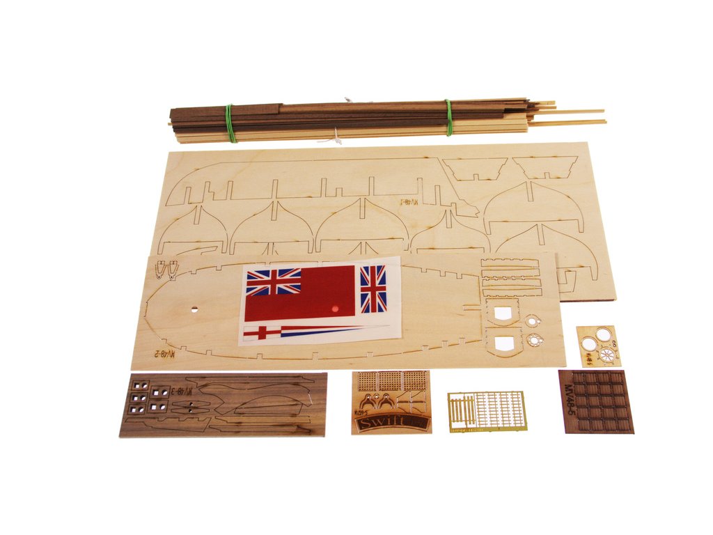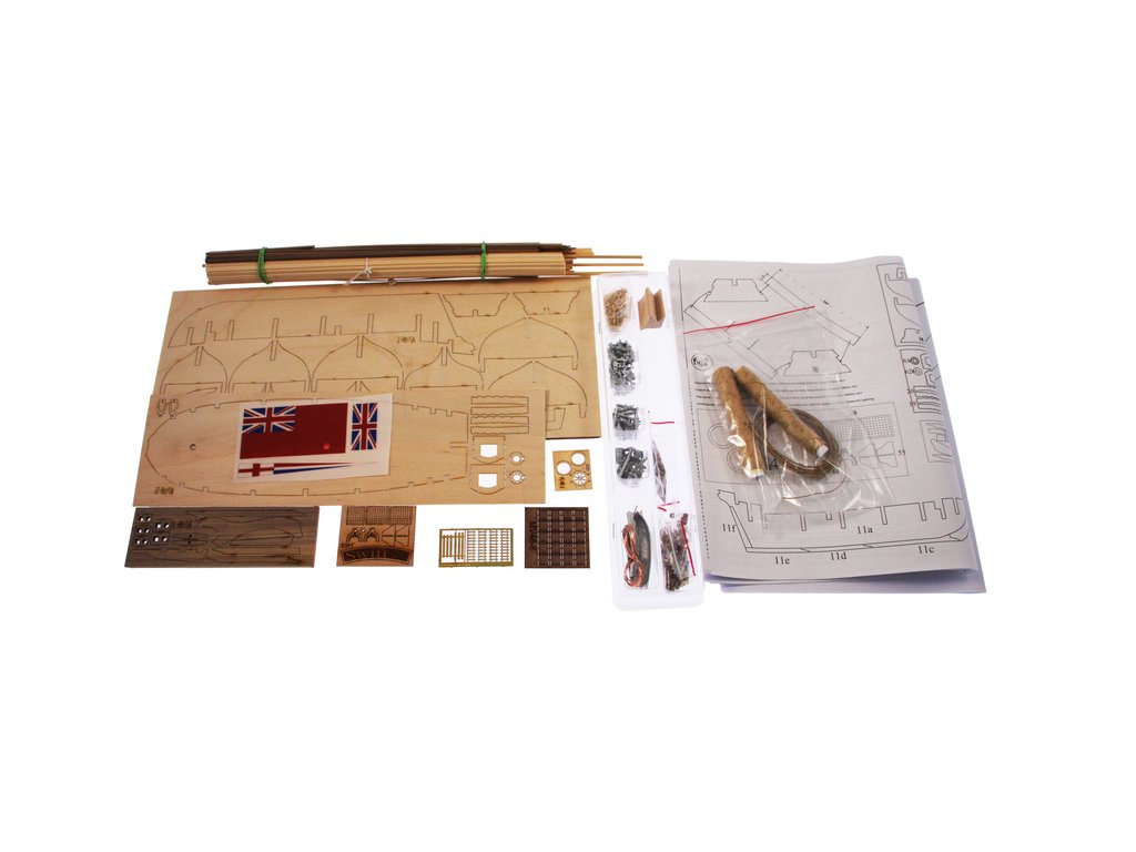 Stavebnice neplovoucího modelu lodi MAMOLI Swift v měřítku 1:70 z roku 1776. HMS Swift byl postaven v roce 1776, pro královské námořnictvo a poté se plavil pod britskou vlajkou v letech 1776 až 1778. V balení jsou dřevěné díly, lišty a množství kování, lanoví, návod, plány atd.