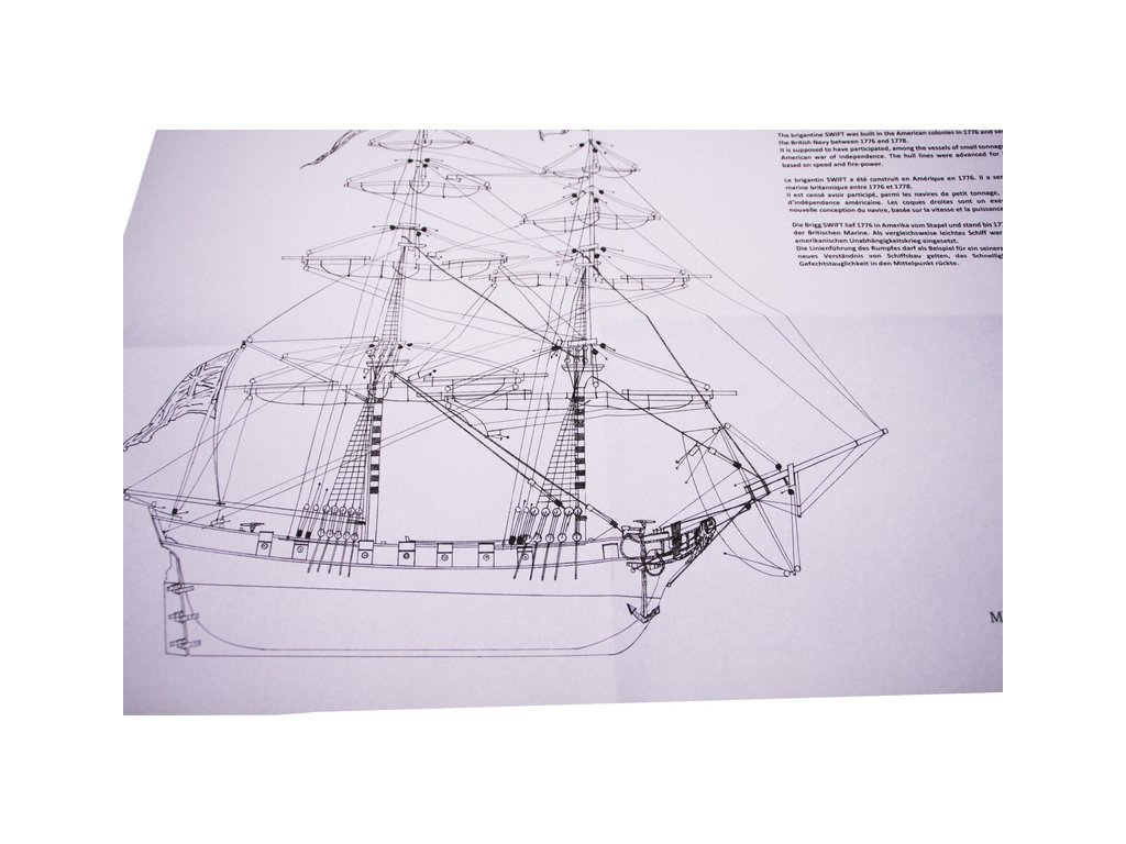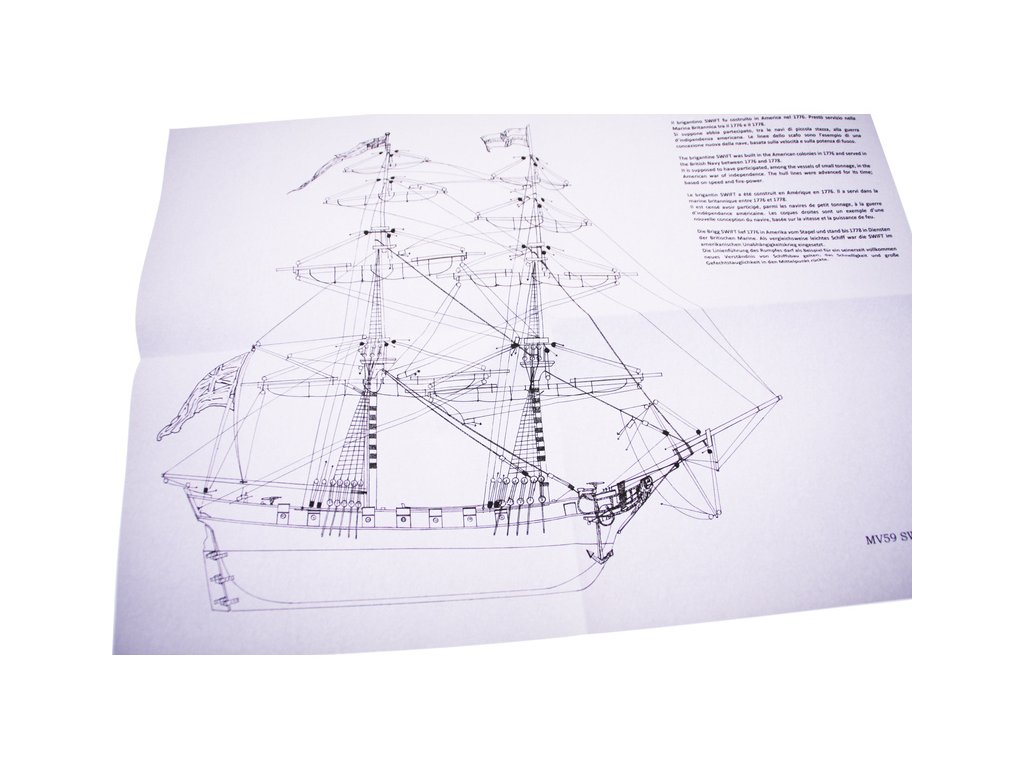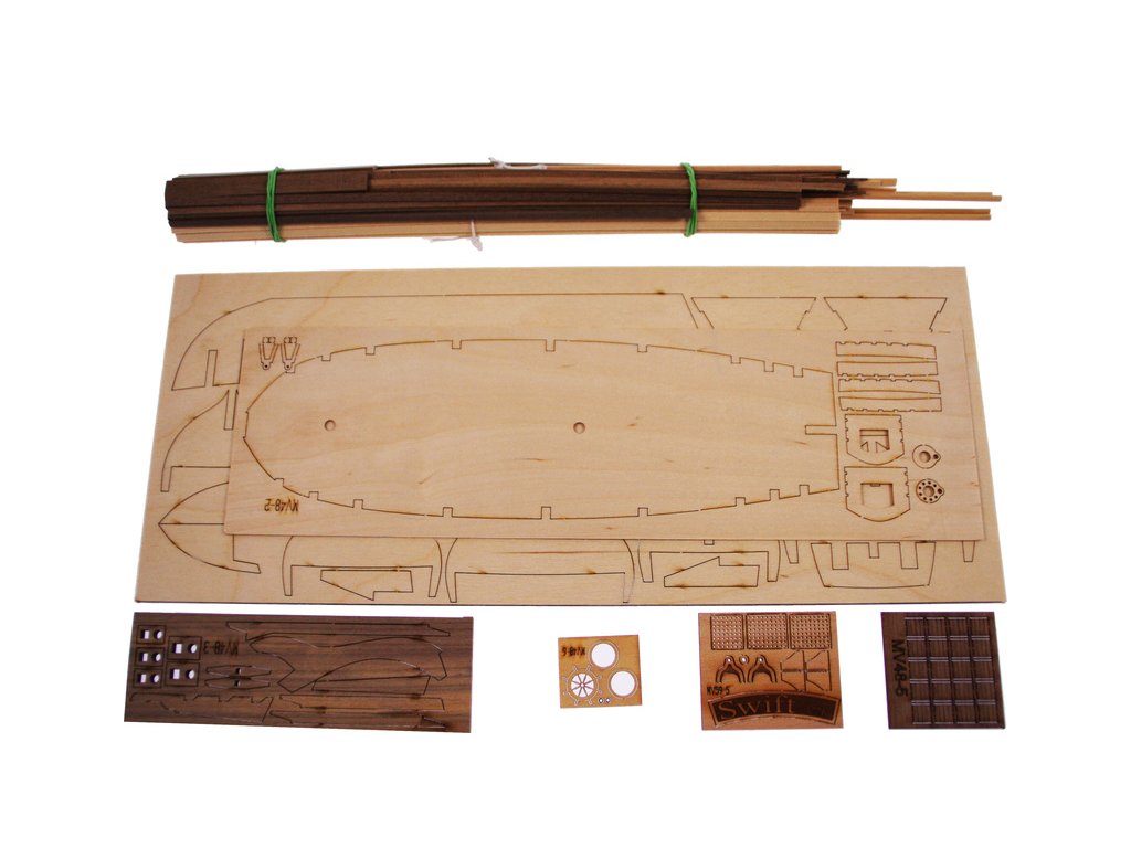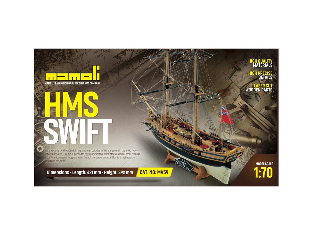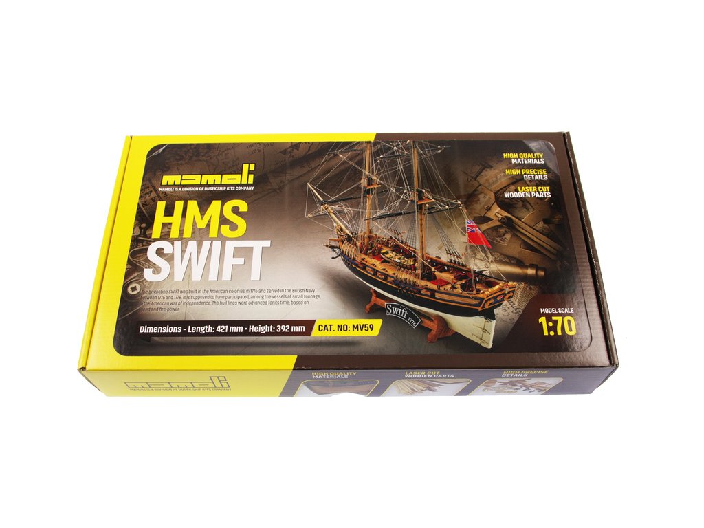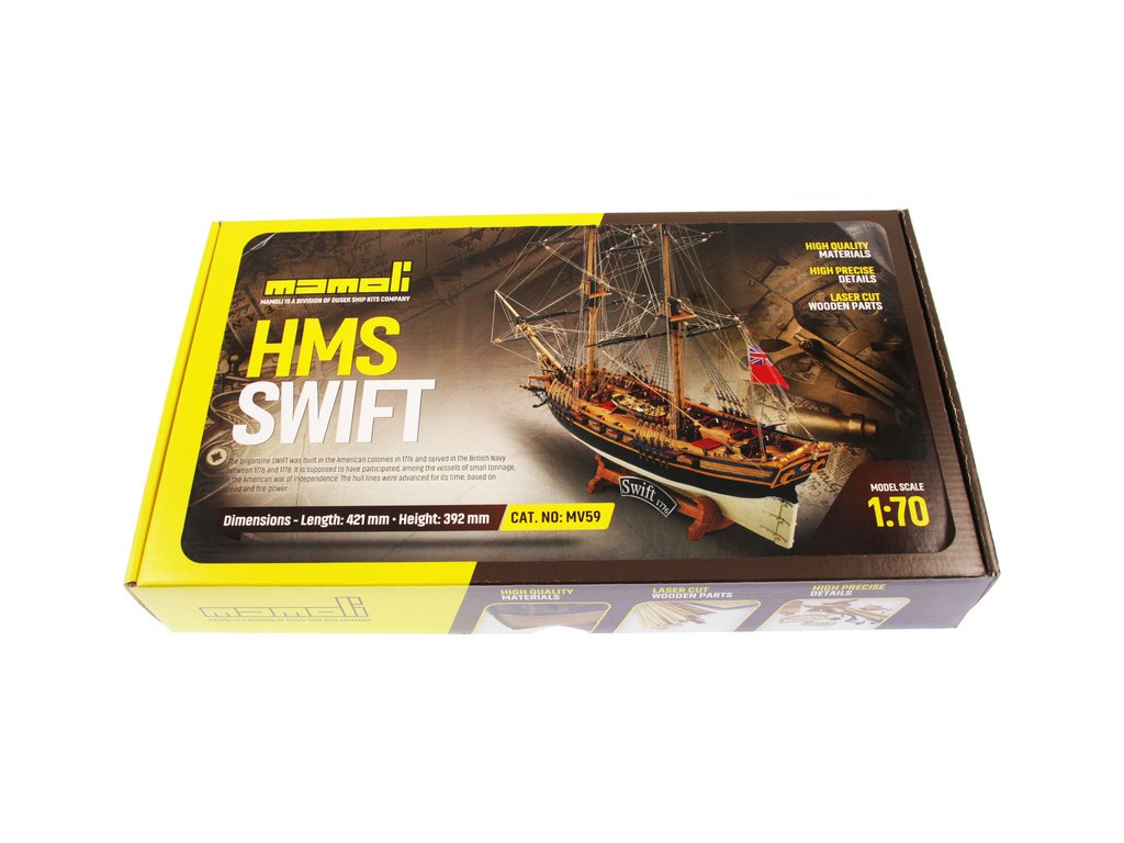 Stavebnice neplovoucího modelu lodi MAMOLI Swift v měřítku 1:70 z roku 1776. HMS Swift byl postaven v roce 1776, pro královské námořnictvo a poté plavil pod britskou vlajkou v letech 1776 až 1778. V balení jsou dřevěné díly, lišty a množství kování, lanoví, návod, plány atd.