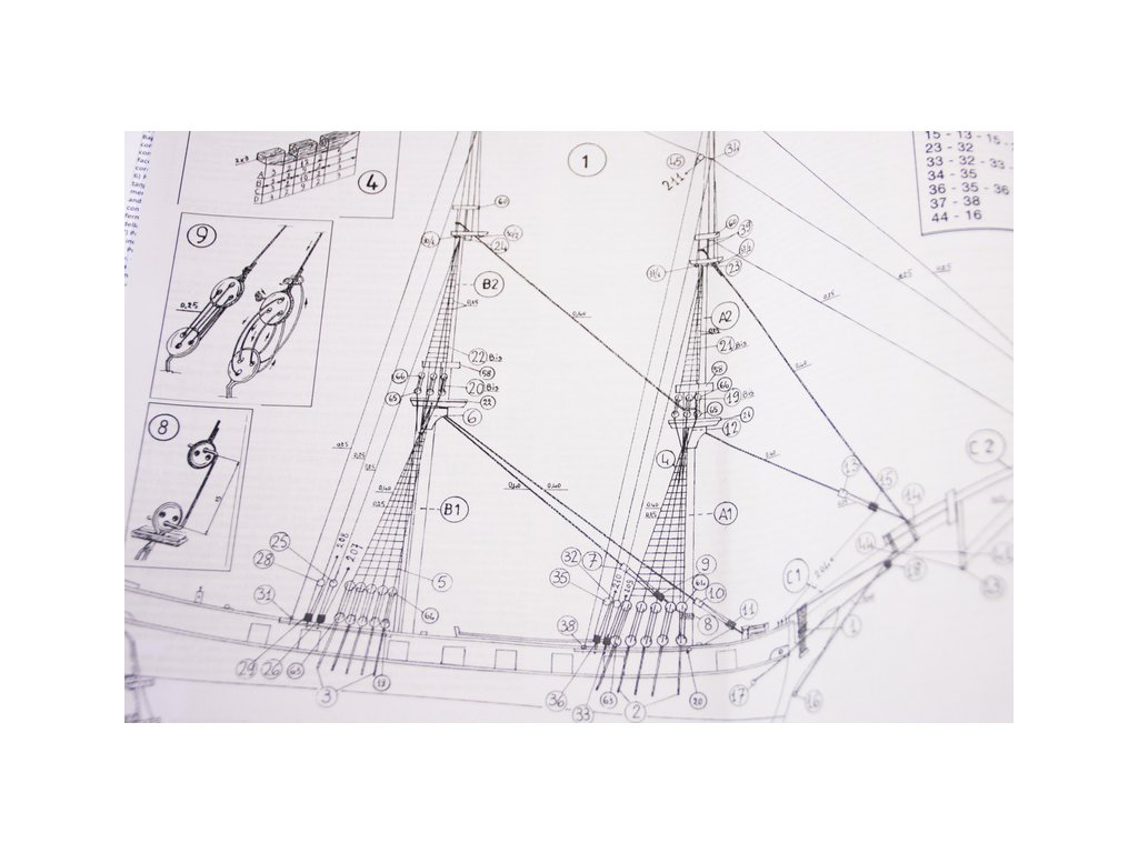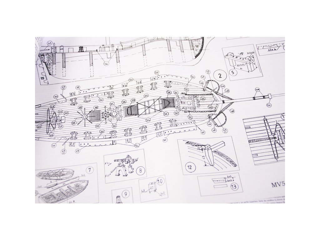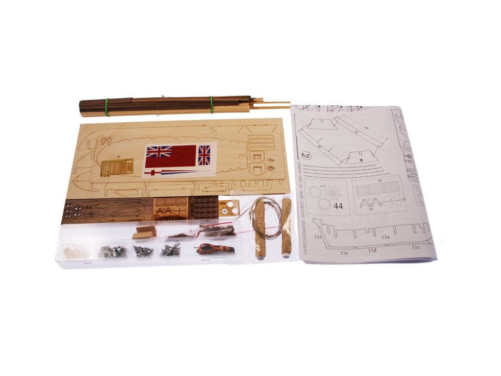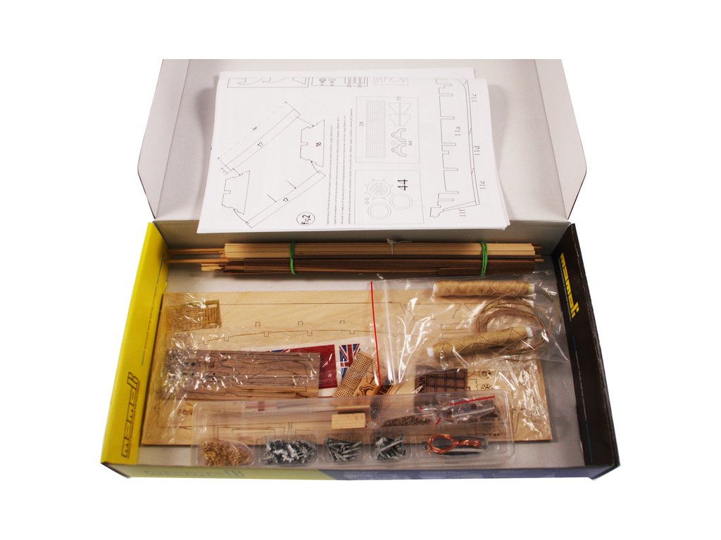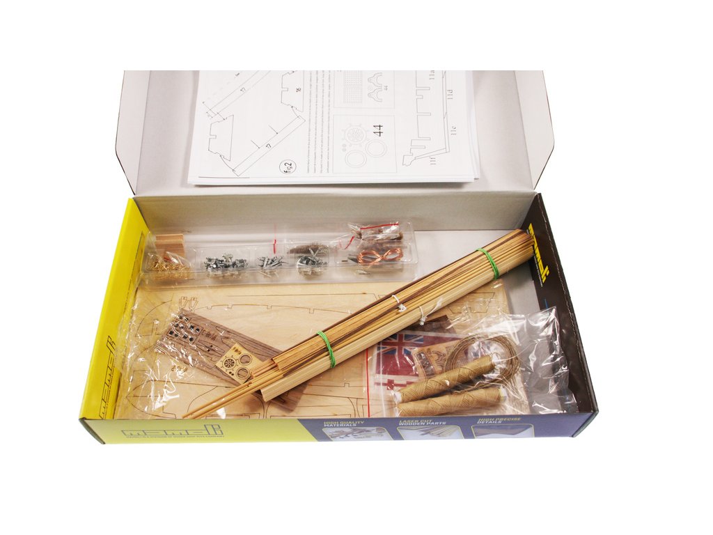 Sada obsahuje 14 kovových děl. Laserem řezané dřevo umožňuje snadnou konstrukci. Ocelové armatury jsou obsaženy stejně jako součástí vybavení jako záchranné čluny a kotvy, bloky. panenky, šňůra, měděný a mosazný řetěz, hřebíky, kovové ozdoby, typové štítky a štítky atd.