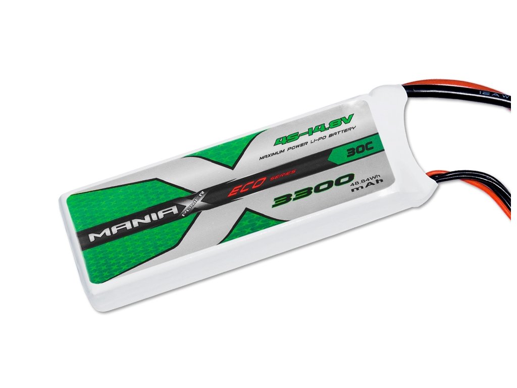 Lithiumpolymerové akumulátory ManiaX řady ECO 30/60C spolehlivě pokrývají potřeby rekreačního modeláře: mají maximální vybíjecí proud 30C, možnost rychlého nabíjení 1-3C, širokou škálu kapacit (450-5000 mAh), výbornou dlouhodobou životnost a příznivou cenu.