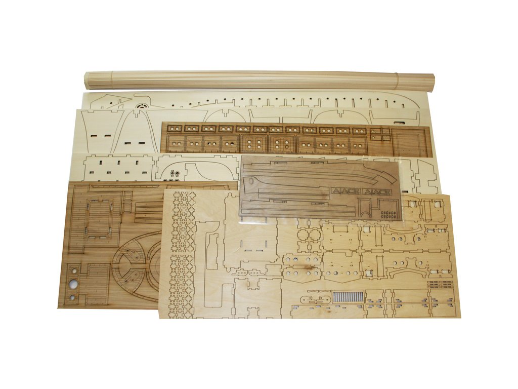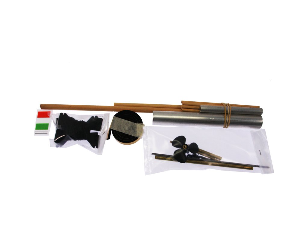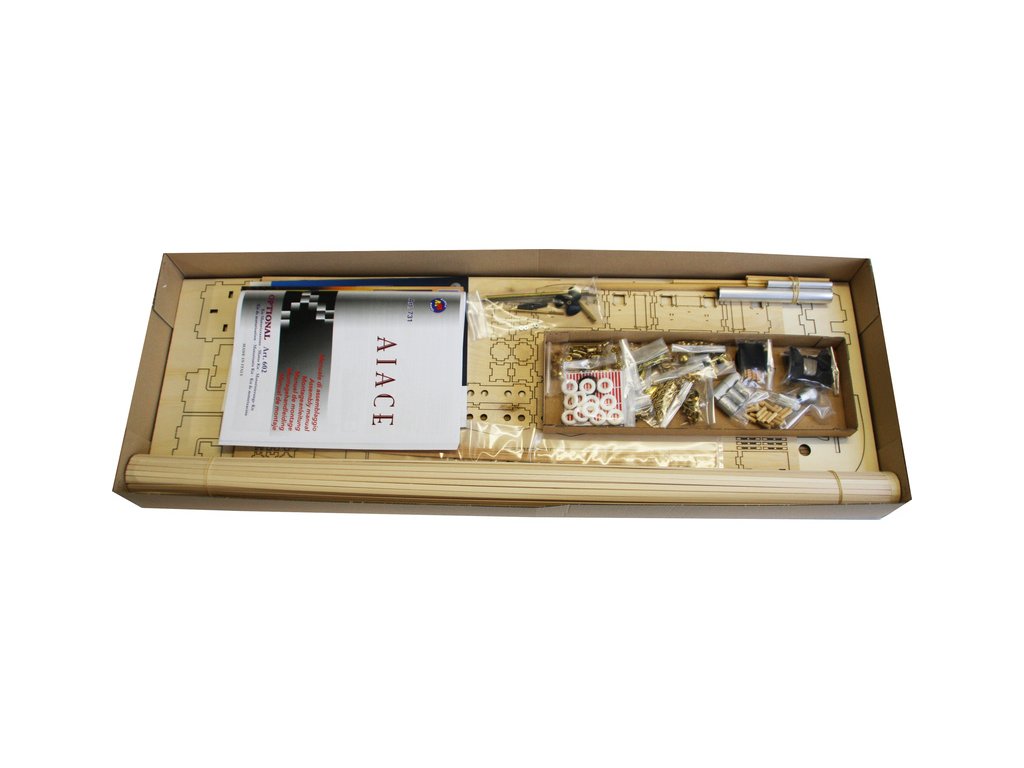 Balení obsahuje sadu překližkových dílů, sadu dřevěných lišt o různém průřezu, blistr s drobnými díly, díly z mosazi, sadu výkresů a vícejazyčný manuál.