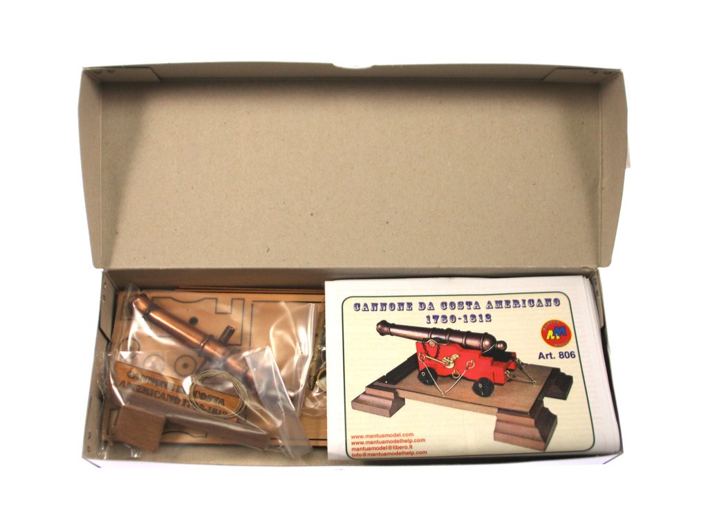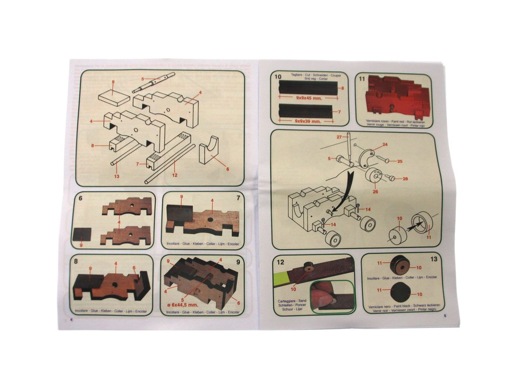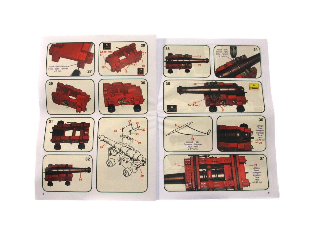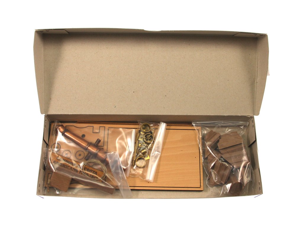 Balení obsahuje laserem vyřezávané dřevěné díly, kovové odlitky, hlaveň, lana, obrázkový vícejazyčný, návod ke stavbě.