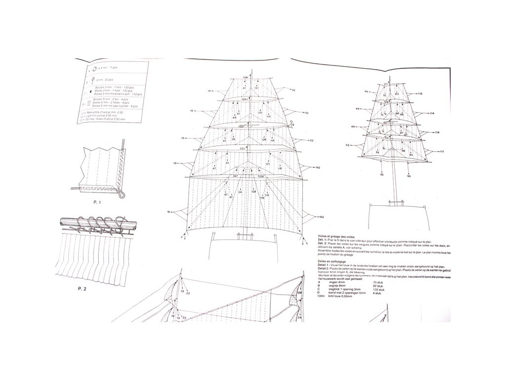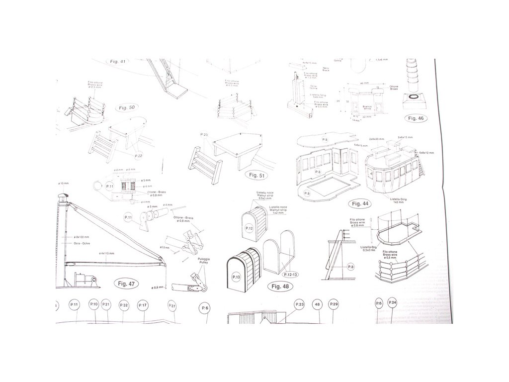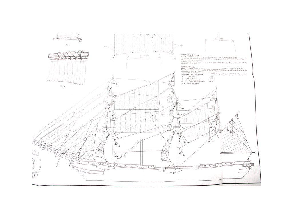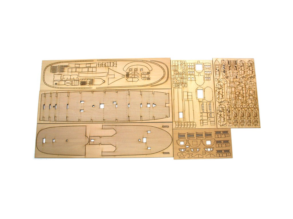 Balení obsahuje laserem řezané dřevěné díly, plaňky, paluby, stožáry, kovové a dřevěné kování, kovové odlitky a dekorace vyleptané z mosazi. Podrobný stavební plán s anglickým popisem se skládá z 9 listů.