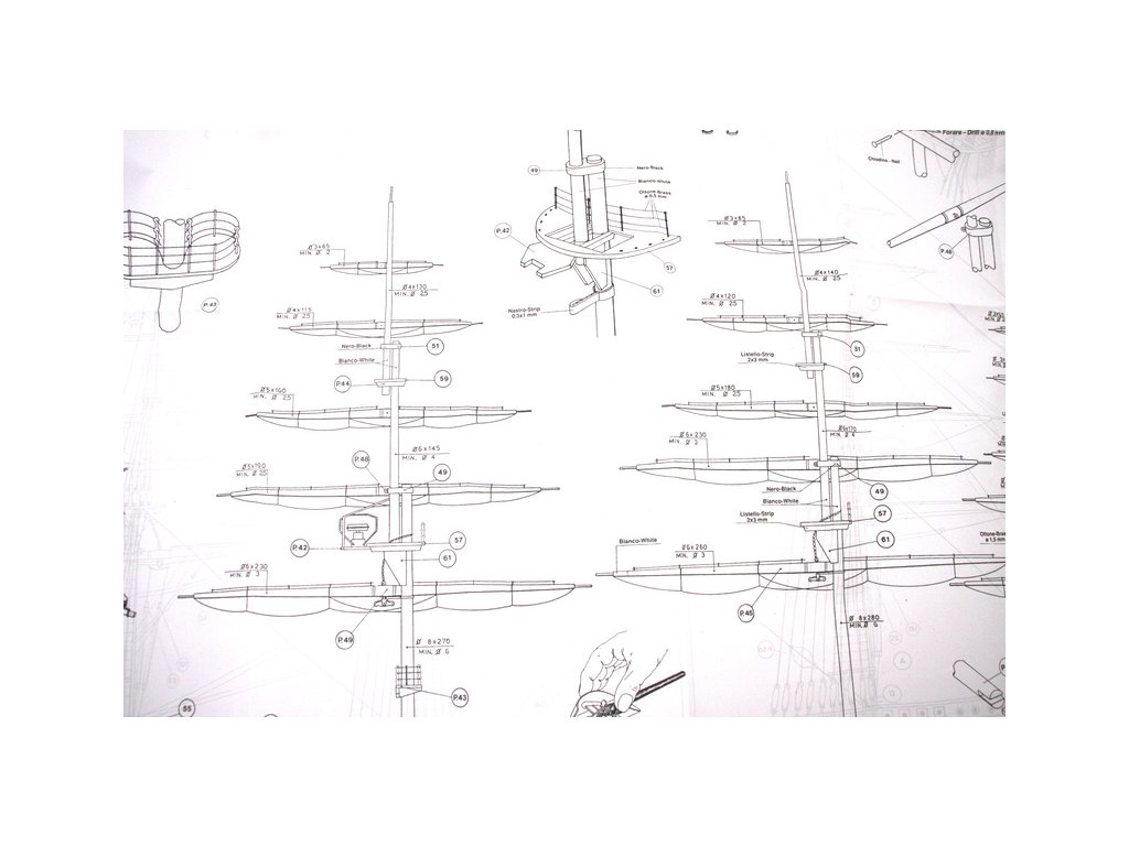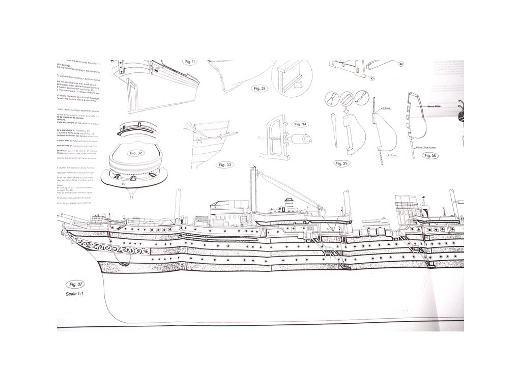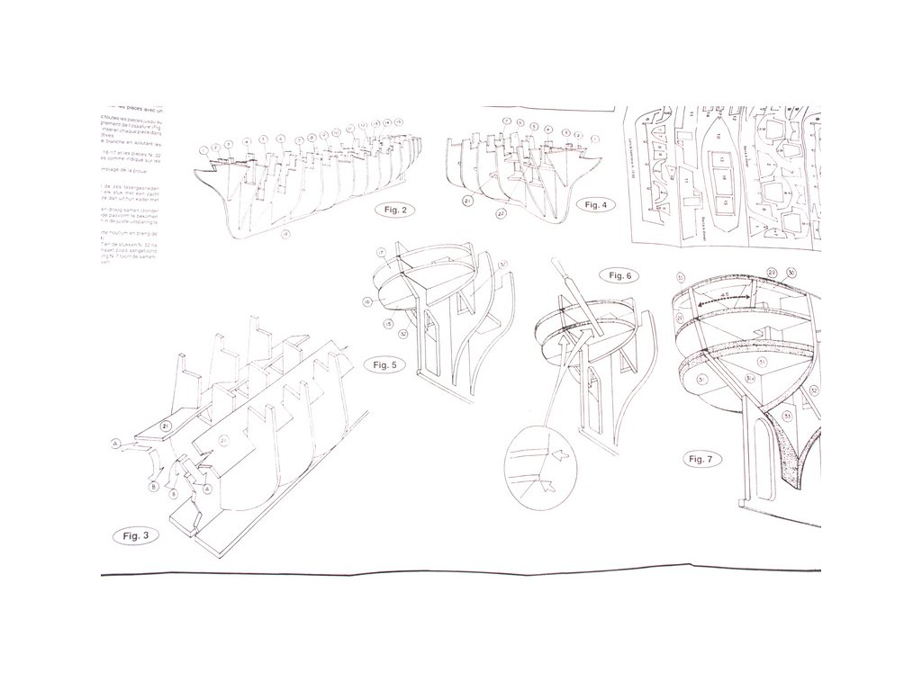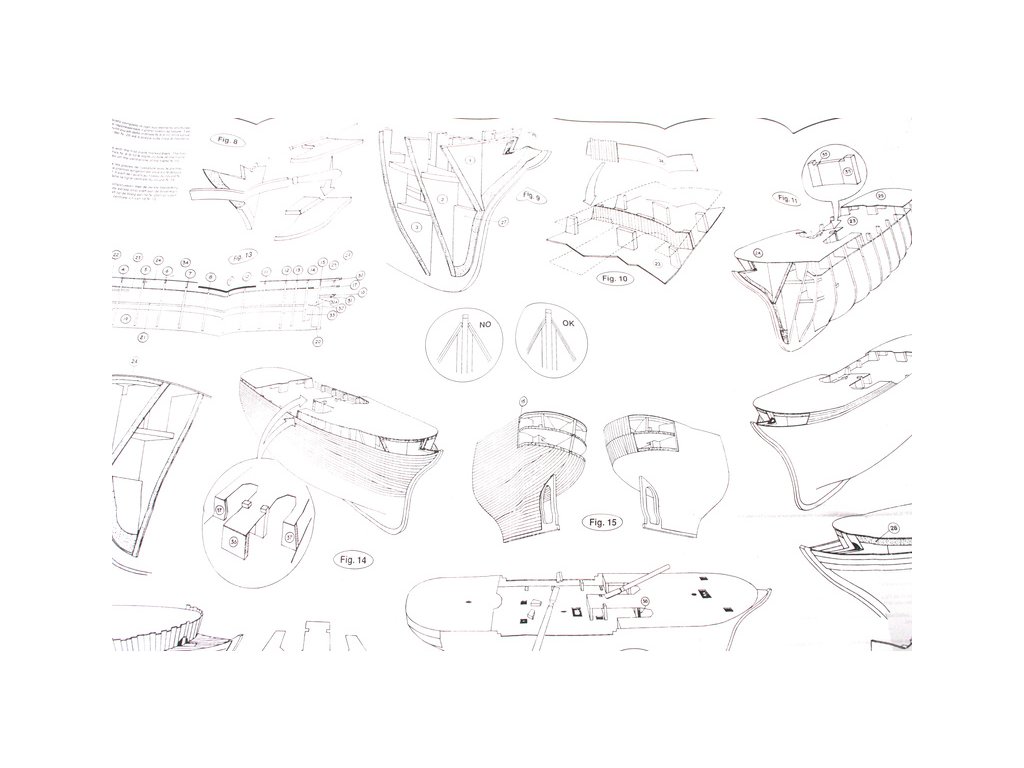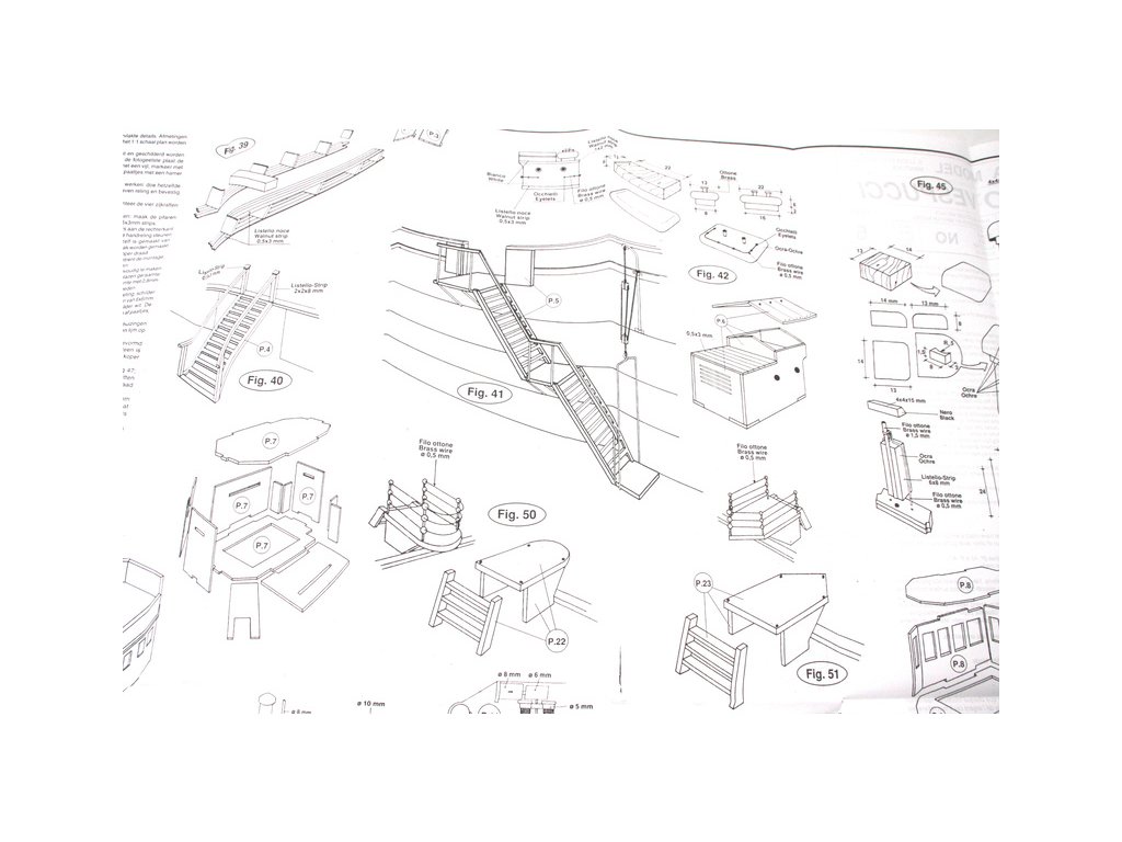 Balení obsahuje laserem řezané dřevěné díly, plaňky, paluby, stožáry, kovové a dřevěné kování, kovové odlitky a dekorace vyleptané z mosazi. Podrobný stavební plán s anglickým popisem se skládá z 9 listů.
