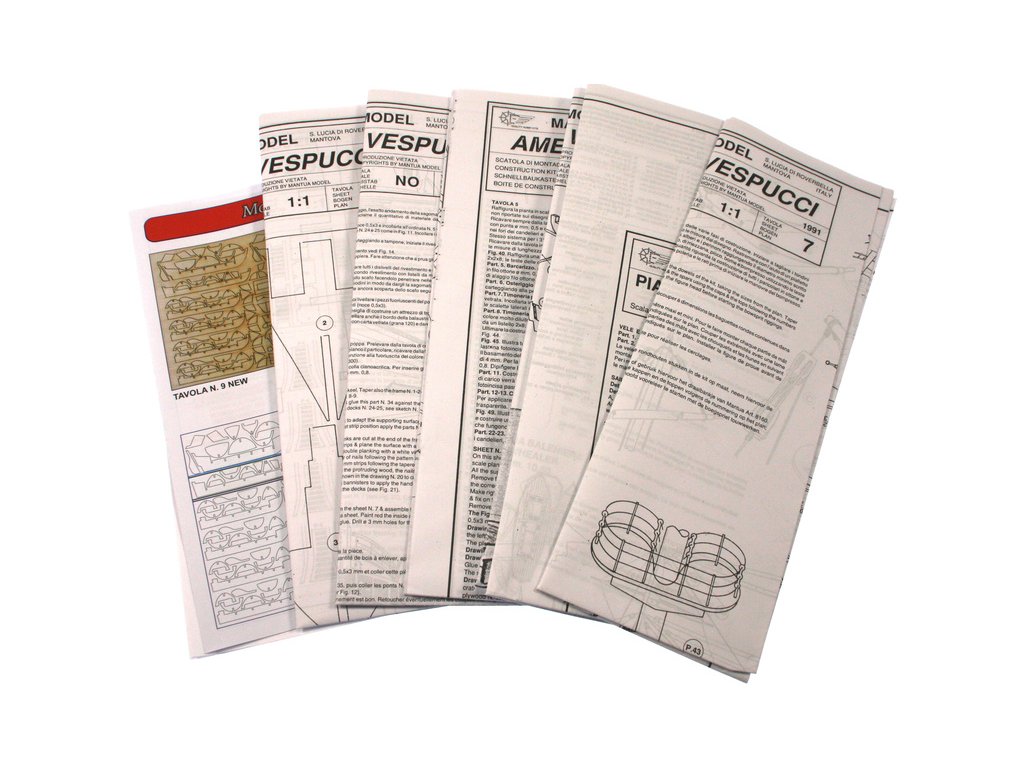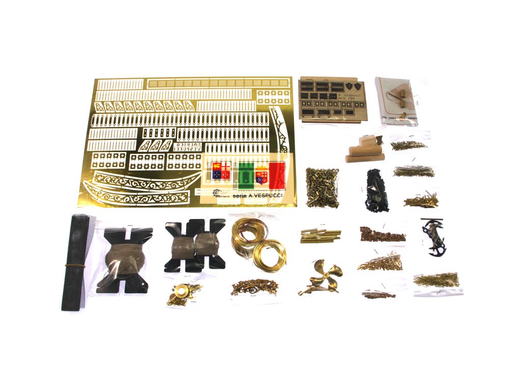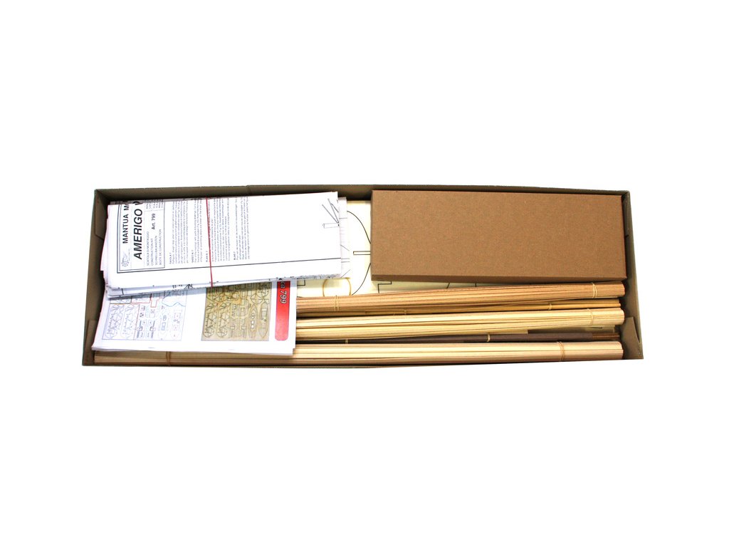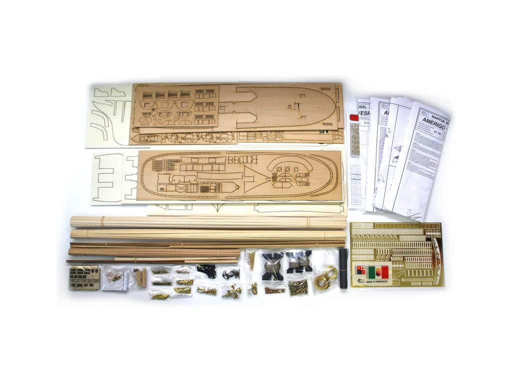 Stavebnice neplovoucího modelu lodi Amerigo Vespucci v měřítku 1:100, v detailním provedením a bohatým lanovím. Výcviková loď byla postavena v roce 1931 jako replika lodí z 18. století. Délka modelu 1 metr. Kit obsahuje dřevěné díly, dvojité plaňkování, kovové odlitky dekorací a podrobné stavení plány a anglickým popisem.