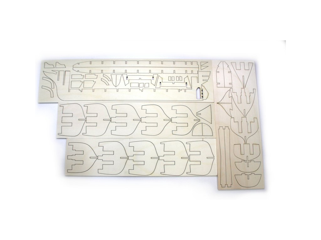 Po otevření víka krabice naleznete dřevěné díly modelu z překližky, lišty, drobné součásti v plastových sáčcích a manuál.