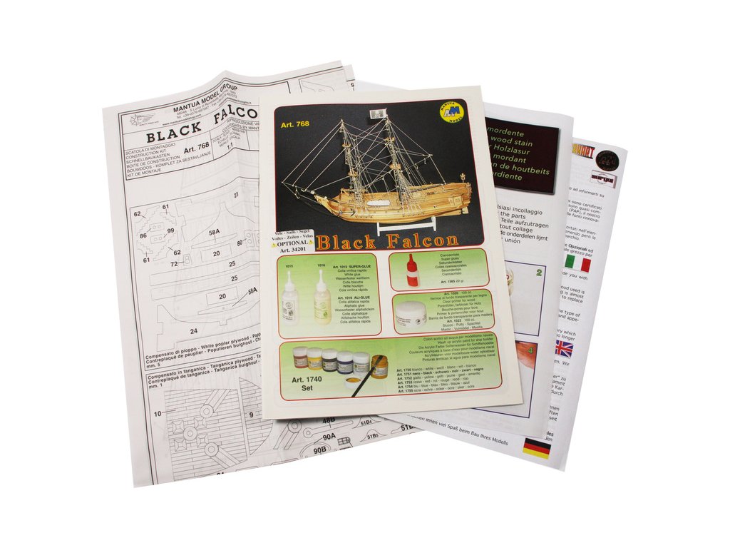 Stavebnice Mantua obsahuje součásti pro stavbu překližkové dřevěné konstrukce trupu, stavební plány s obecnými detaily v angličtině, lišty, dřevěné stěžně a ráhna, mosazné a ořechové kování, detaily z leptané mosazi, na lanoví šňůry. Všechny plechové součásti jsou přesně řezány laserem. Plachty lodi jsou k dispozici jako volitelné příslušenství Mantua Model Sada plachet: Black Falcon