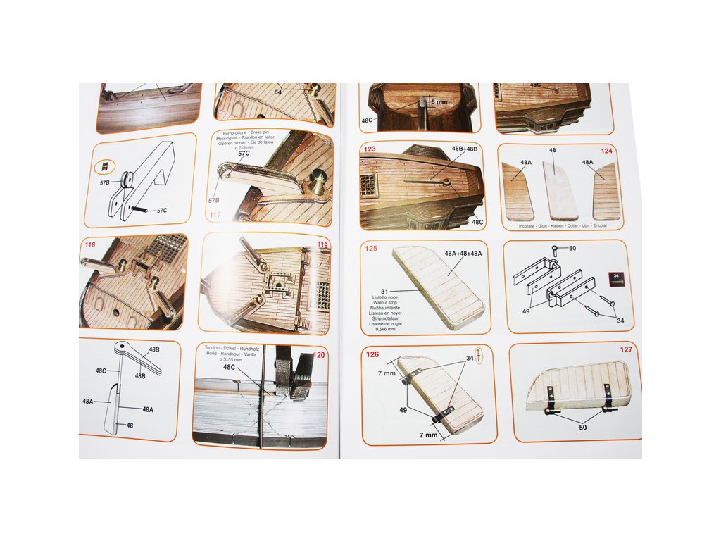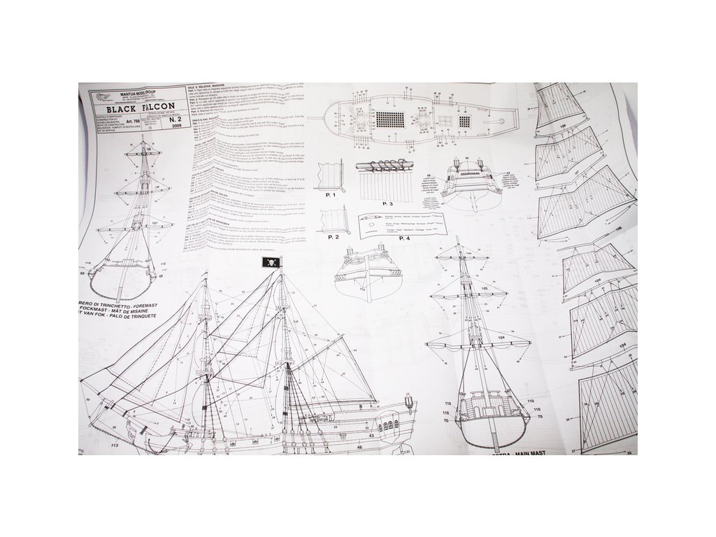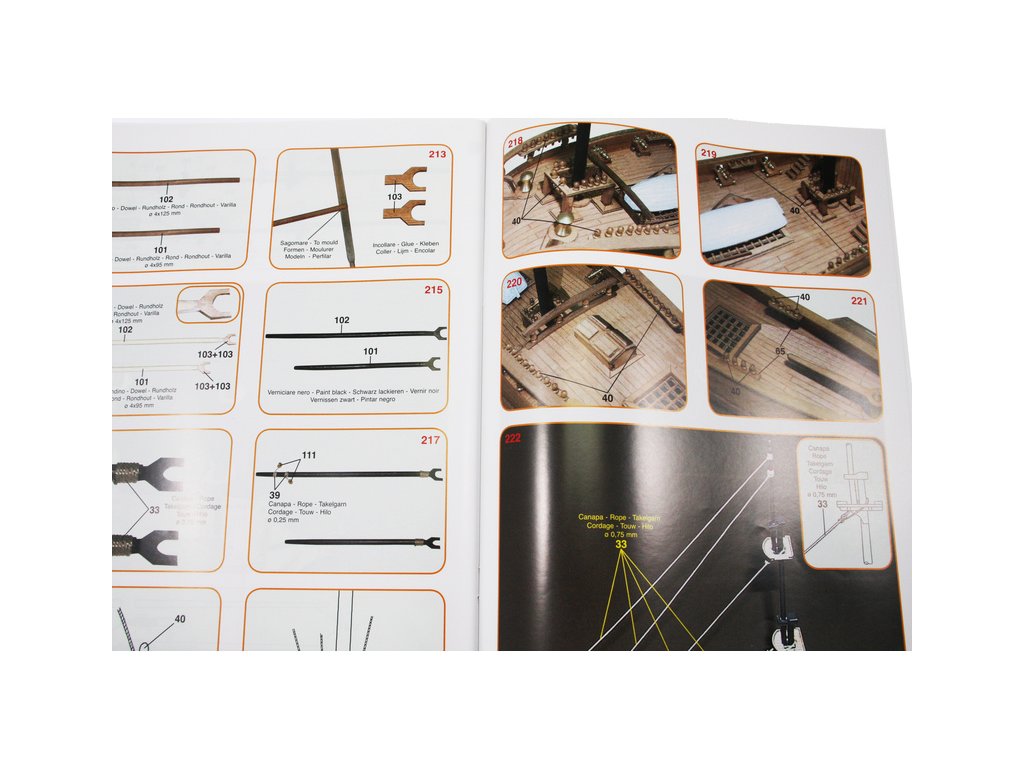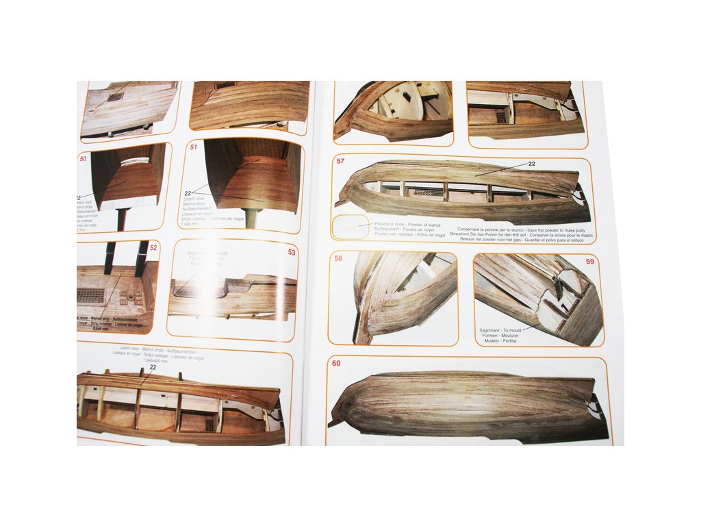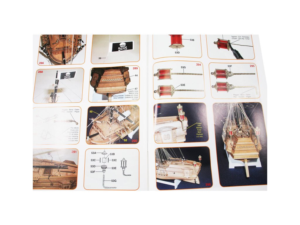 Set obsahuje kompletní sadu výkresové dokumentace modelu v měřítku 1:1 s obrázky jednotlivých detailů. Na výkrese jsou v měřítku nakresleny montážní sestavy, jejich kompletace a to včetně stěžňů a ráhen a způsob vázání lanoví. Vícejazyčný postup stavby rámcově upravuje logické sestavení jednotlivých komponentů.