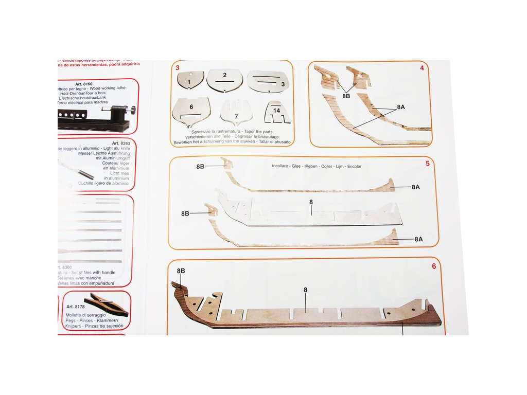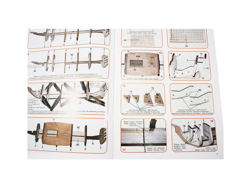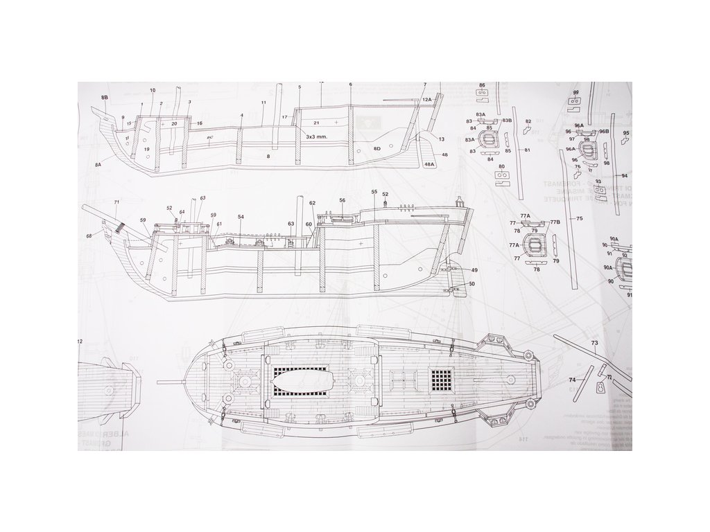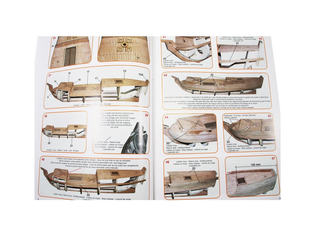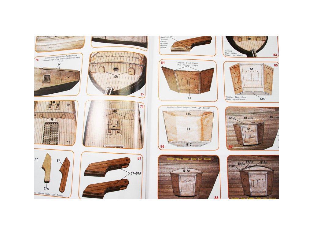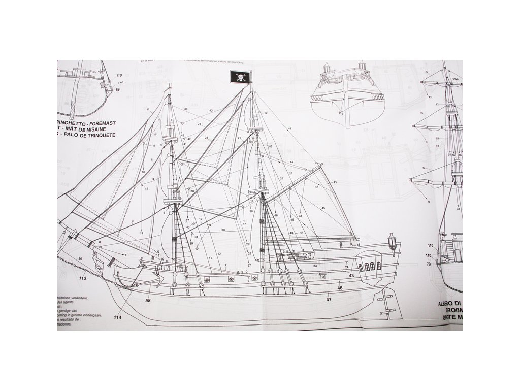 Set obsahuje kompletní sadu výkresové dokumentace modelu v měřítku 1:1 s obrázky jednotlivých detailů. Na výkrese jsou v měřítku nakresleny montážní sestavy, jejich kompletace a to včetně stěžňů a ráhen a způsob vázání lanoví. Vícejazyčný postup stavby rámcově upravuje logické sestavení jednotlivých komponentů.