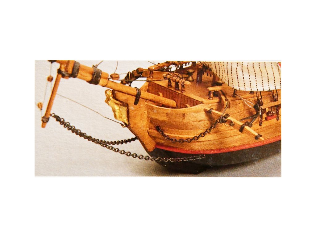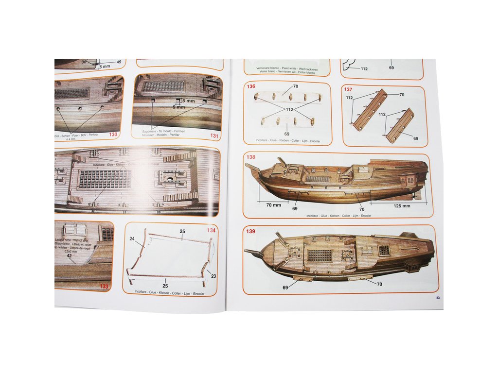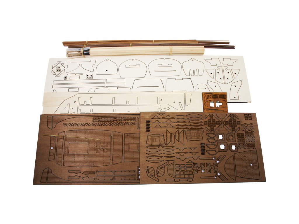 Balení obsahuje laserem řezané dřevěné díly, plaňky, paluby, sadu lišt, kovové a dřevěné součásti, kovové odlitky a dekorace. Stavební plány, vícejazyčný návod.