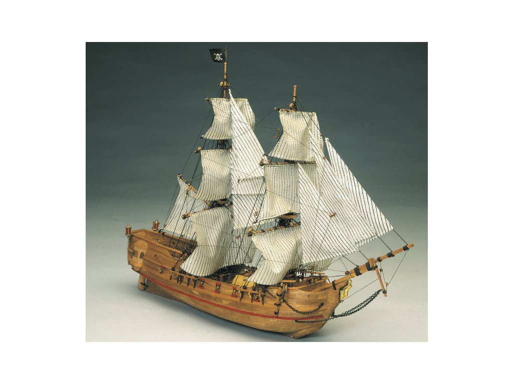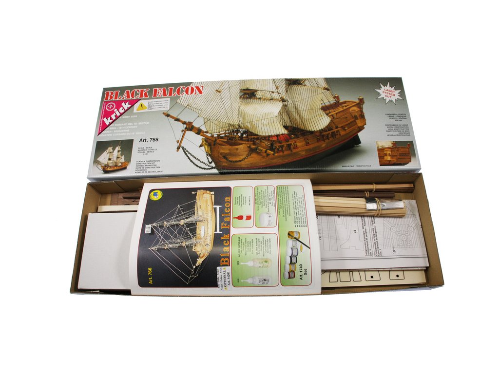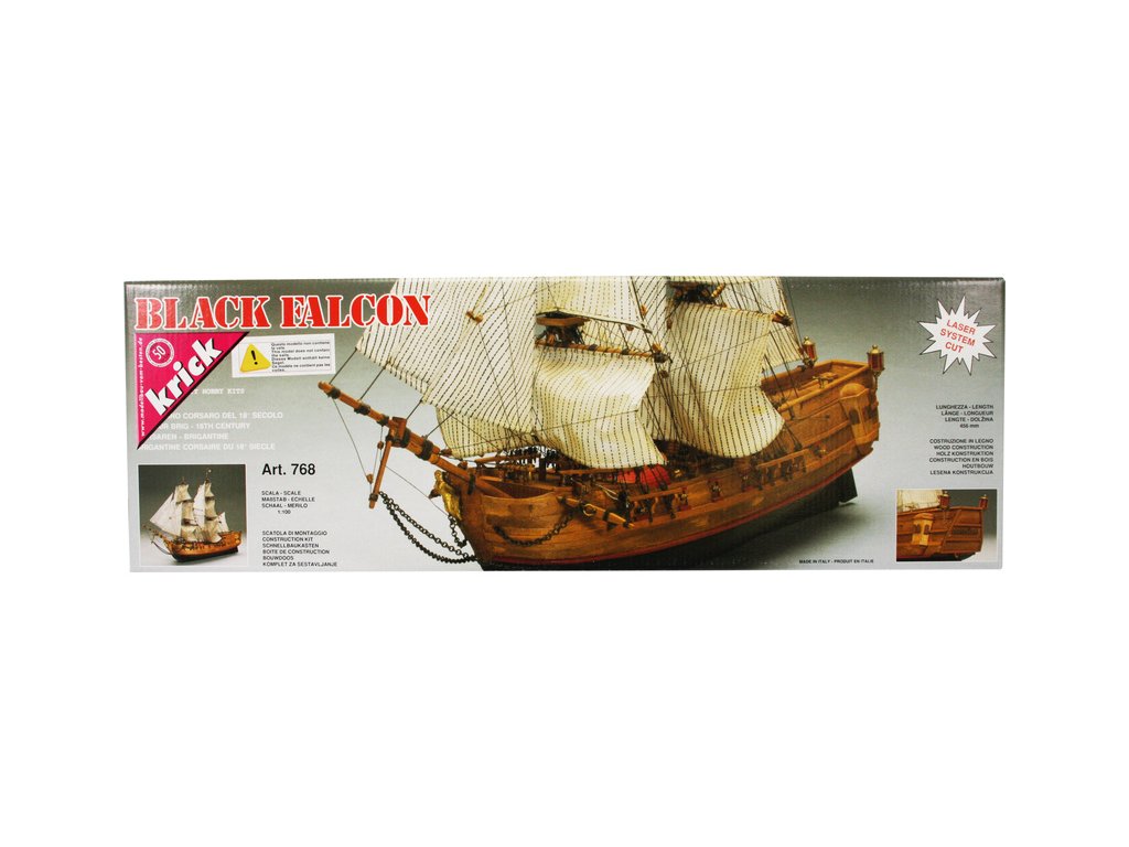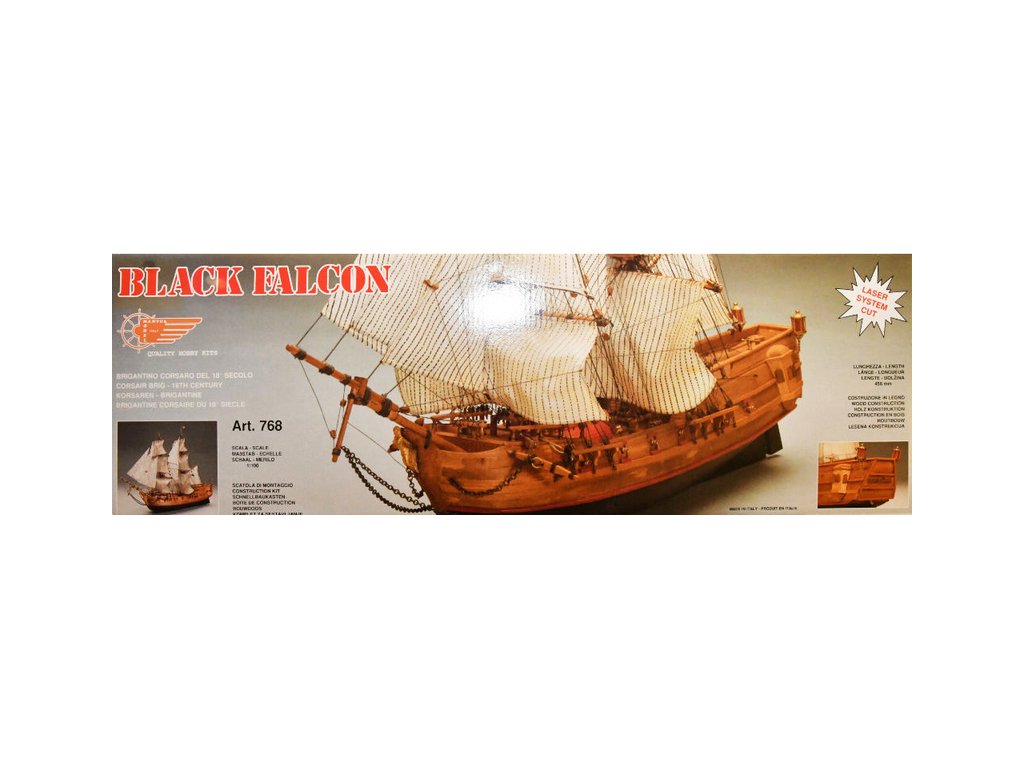 Stavebnice neplovoucího modelu lodi Mantua Model Black Falcon v měřítku 1:100 a délce 456 mm. Dvoustěžňová briga z 18. století, které velel nechvalně známý pirátský kapitán Kidd. Kit obsahuje dřevěné díly, kovové odlitky dekorací a podrobné stavební plány.