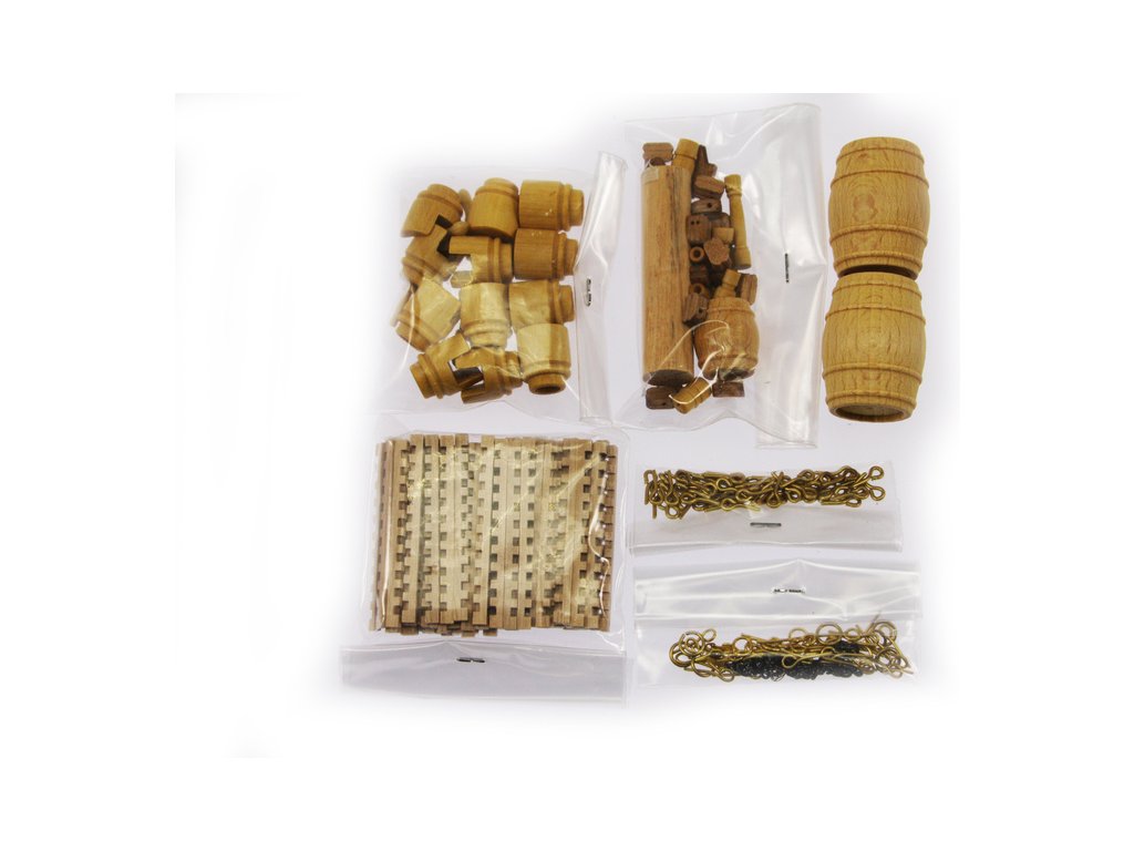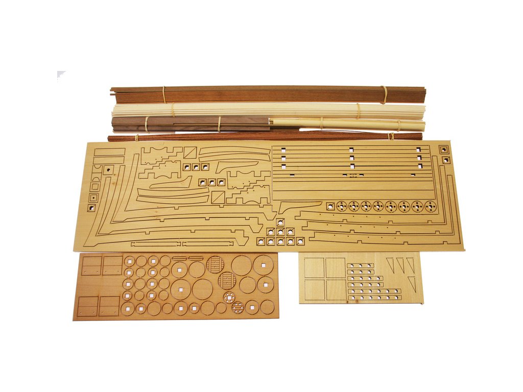 Balení obsahuje sadu překližkových dílů, sadu dřevěných lišt o různém průřezu, sáčky s drobnými díly, díly z mosazi, sadu výkresů a vícejazyčný manuál.