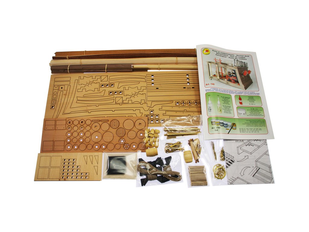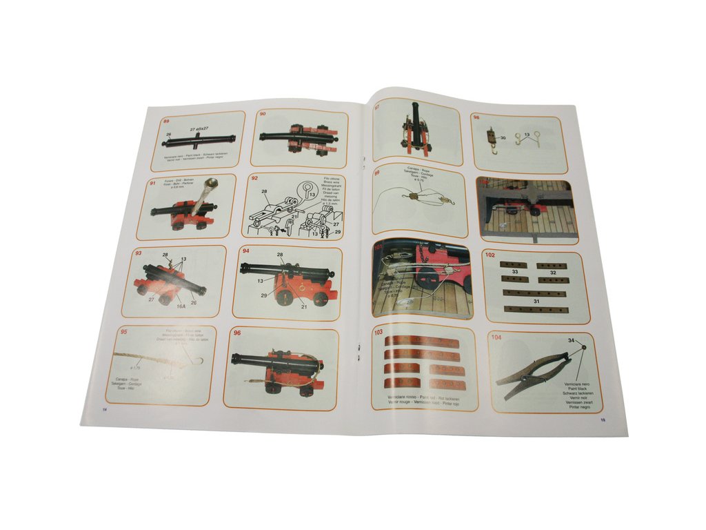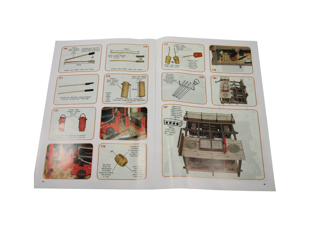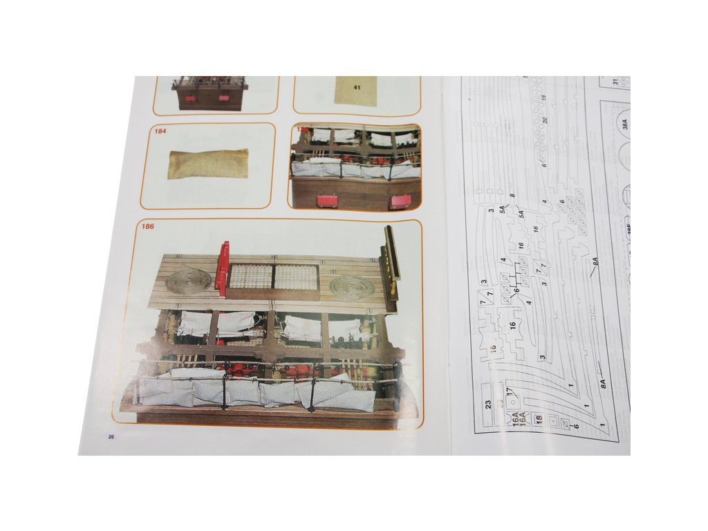 Kromě stavebního plánu vytištěného na obou stranách s mnoha podrobnými výkresy pomáhají s dokončením modelu ilustrované vícejazyčné stavební pokyny. Zajímavý a podrobný model je řez typickou anglickou bojovou lodí z počátku 19. století. Všechny dřevěné součásti jsou řezány laserem, dvojité lamely pro opláštění, dvě zdobená mosazná děla, všechna potřebná dřevěná a kovová kování spolu se stavebními plány s obecnými pokyny.