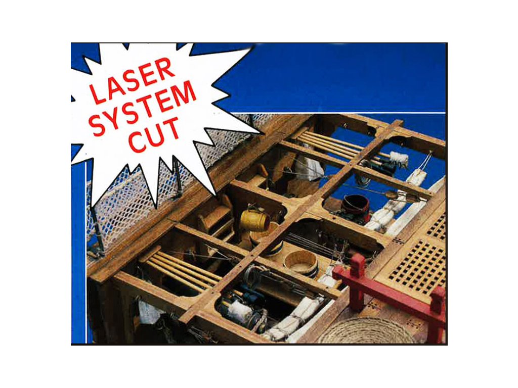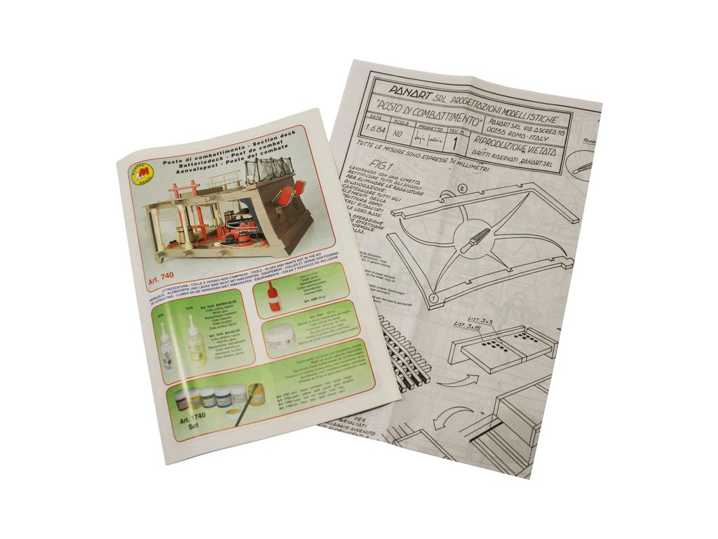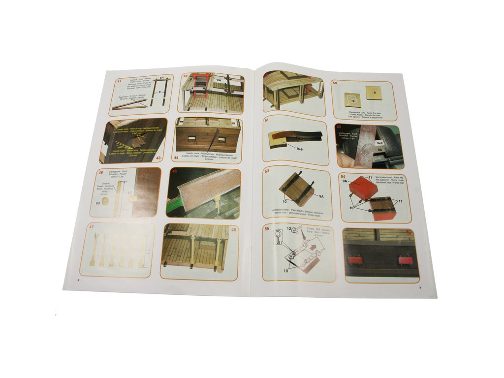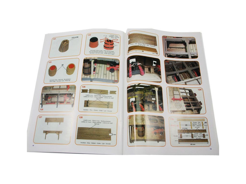 Kromě stavebního plánu vytištěného na obou stranách s mnoha podrobnými výkresy pomáhají s dokončením modelu ilustrované vícejazyčné stavební pokyny. Zajímavý a podrobný model je řez typickou anglickou bojovou lodí z počátku 19. století. Všechny dřevěné součásti jsou řezány laserem, dvojité lamely pro opláštění, dvě zdobená mosazná děla, všechna potřebná dřevěná a kovová kování spolu se stavebními plány s obecnými pokyny.