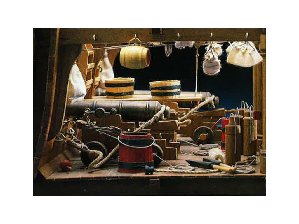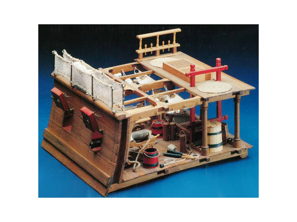 Mantua Model Dělová paluba řez v měřítku 1:23 kit, je model střeleckého stanoviště na typické britské válečné lodi z počátku 18. století. Sada obsahuje všechny díly, potřebné k dokončení modelu, rozměry 250 x 250 x 170mm. dvě 100mm dlouhá soustružená mosazná děla na vozících z ořechového dřeva, kbelíky, náboje, zátky, nádoby na prach, stoly a lavice, střelný prach a sudy s vodou.