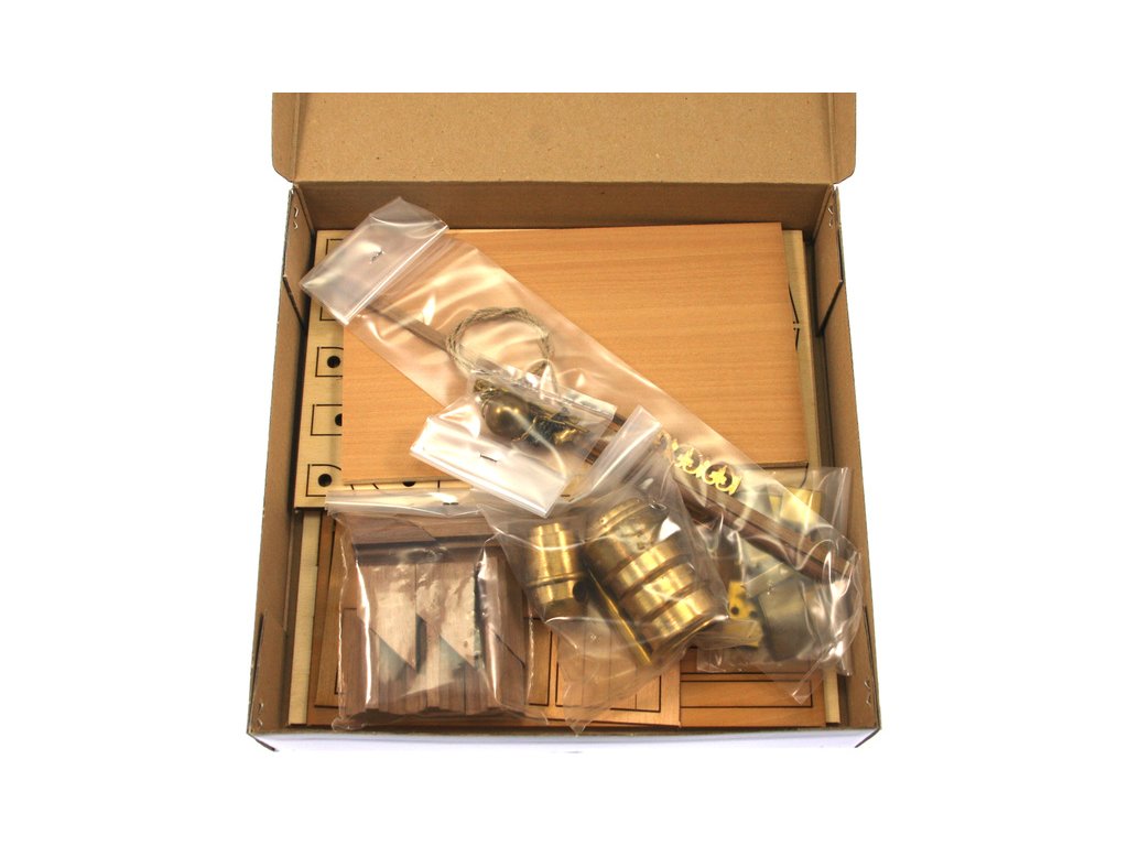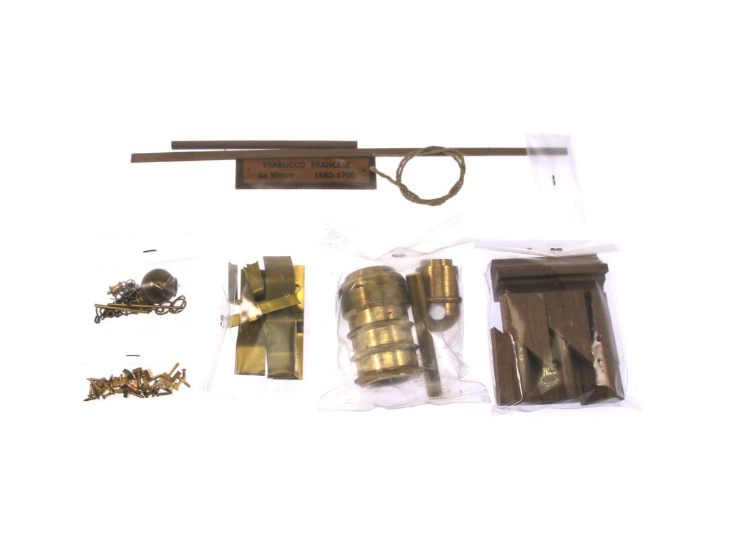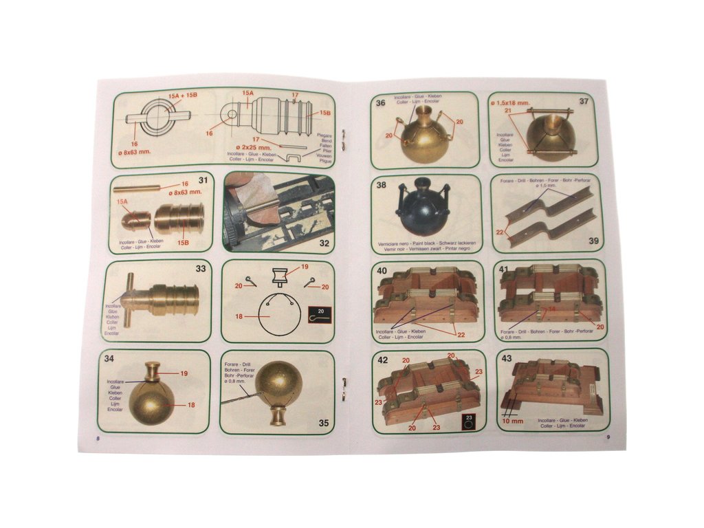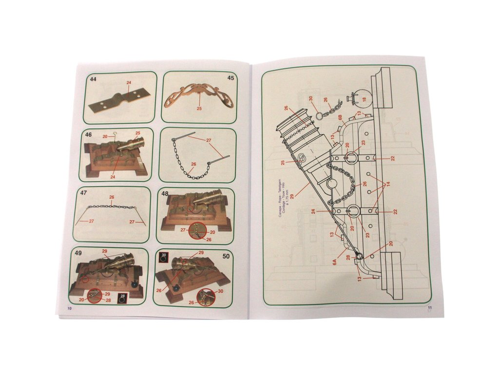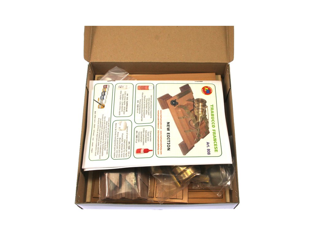 Balení obsahuje laserem vyřezávané dřevěné díly, hlaveň, kovové odlitky, lana, obrázkový návod ke stavbě.