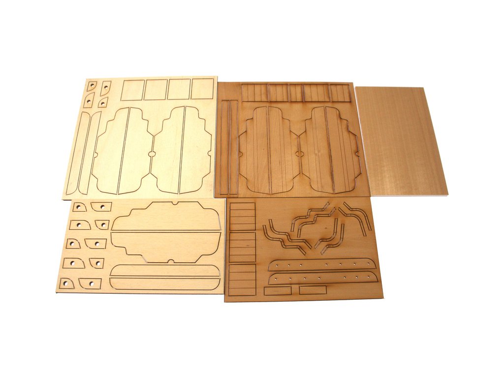 Po otevření víka krabice naleznete dřevěné díly modelu z překližky, lišty, drobné součásti v plastových sáčcích a manuál.