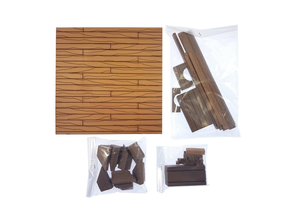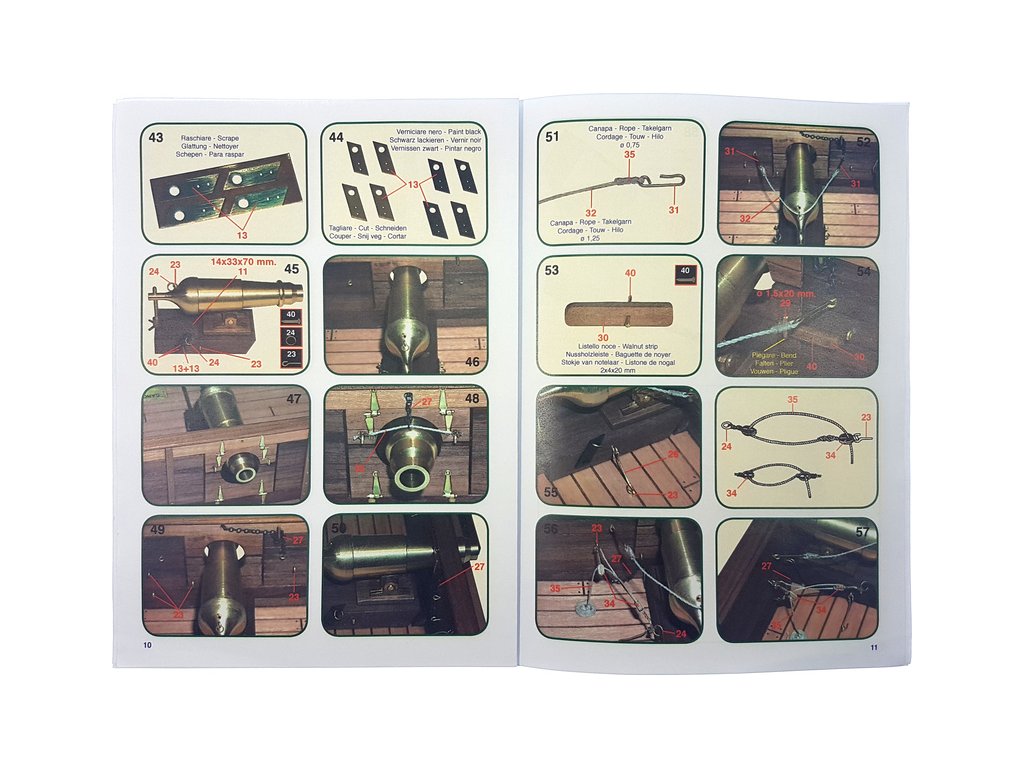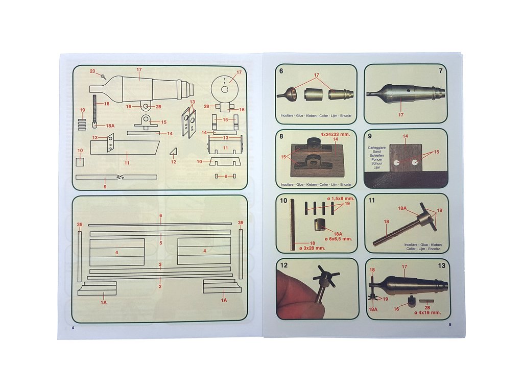 Balení obsahuje laserem vyřezávané dřevěné díly, hlaveň, kovové odlitky, lana, obrázkový návod ke stavbě.