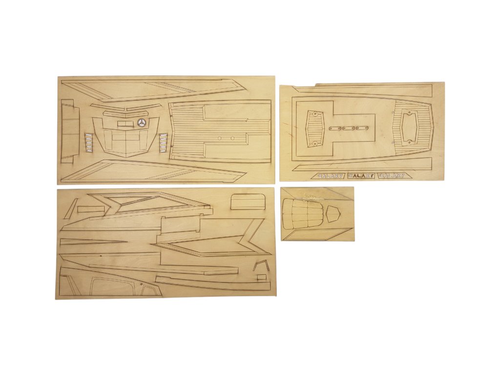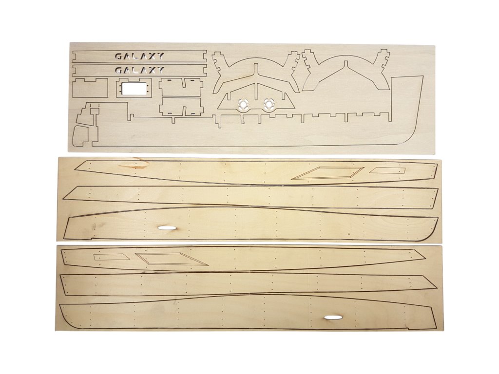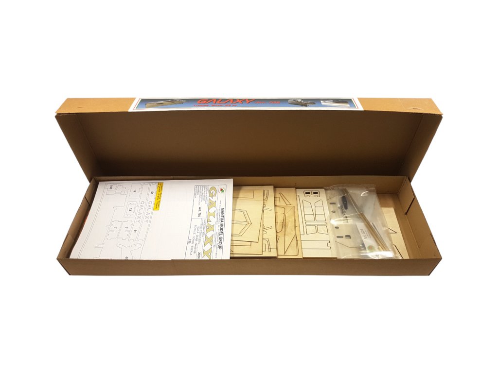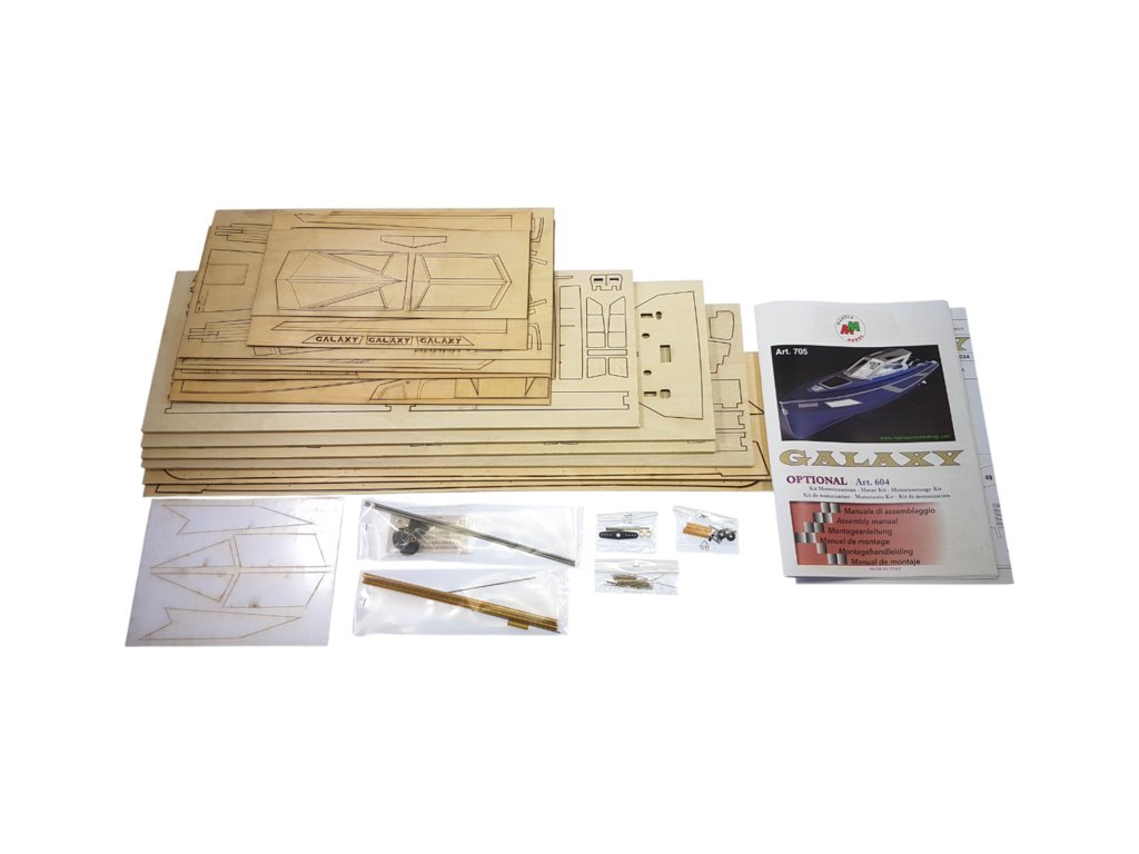 Stavebnice modelu lodi Mantua Model Galaxy 53ft luxusní jachta 1:25. Obsaženy jsou díly pro stavbu modelu jako například - laserem řezaná překližka a další díly pro detailní zpracování, hřídele a dva lodní šrouby. Lze sestavit jako neplovoucí maketu i RC model.