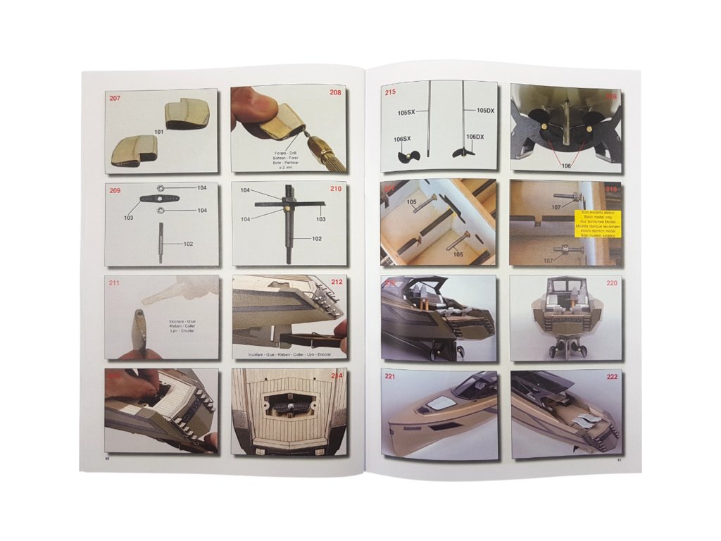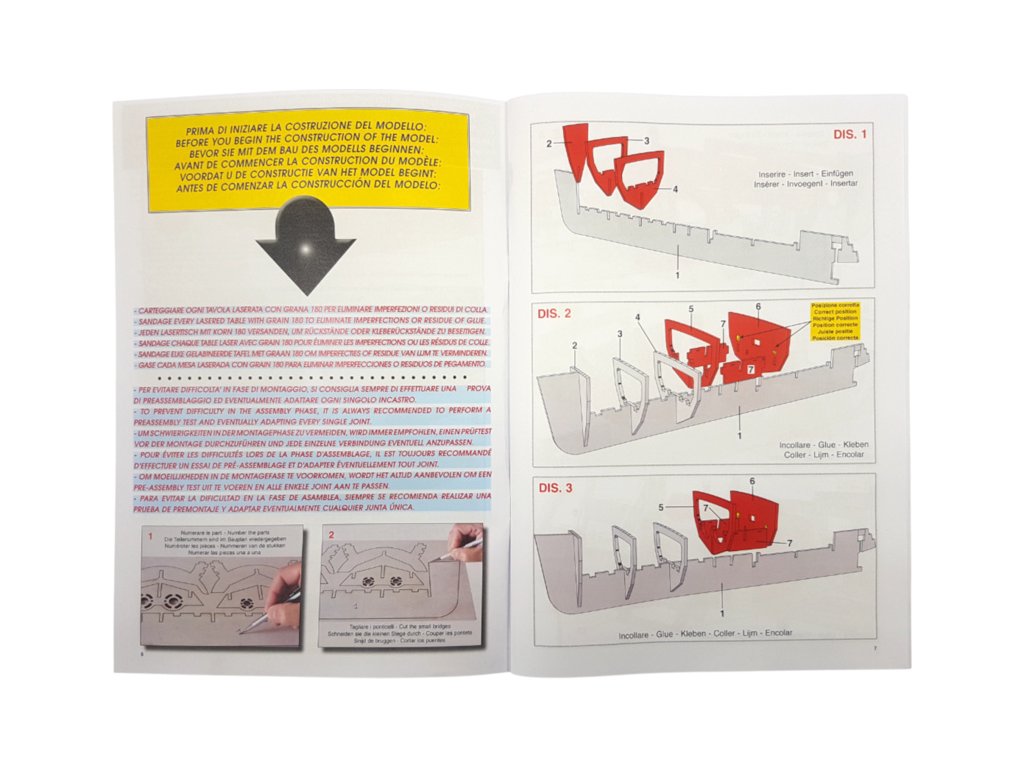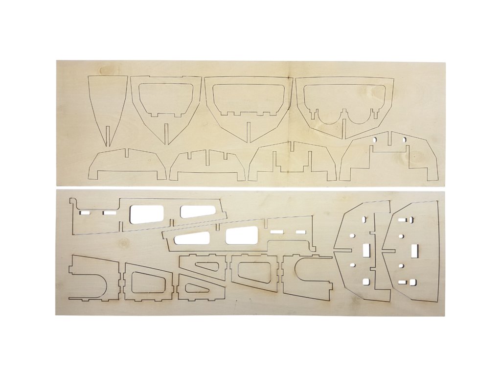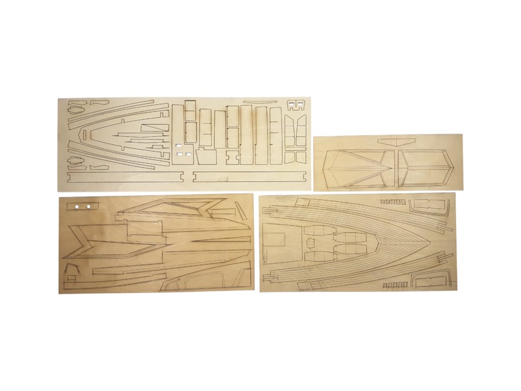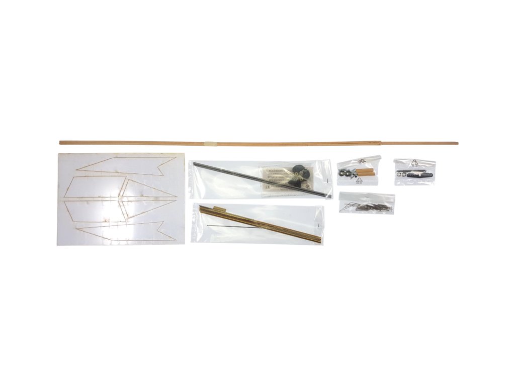 Balení obsahuje laserem řezané překližkové díly, laserem řezaný čirý plast, lišty, 2x hřídel, 2x lodní šroub, páka, spojovací materiál, sada výkresů a vícejazyčný manuál.