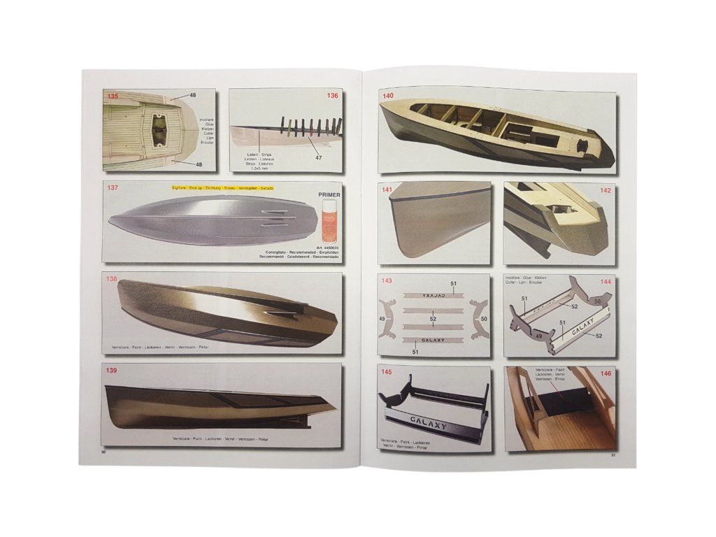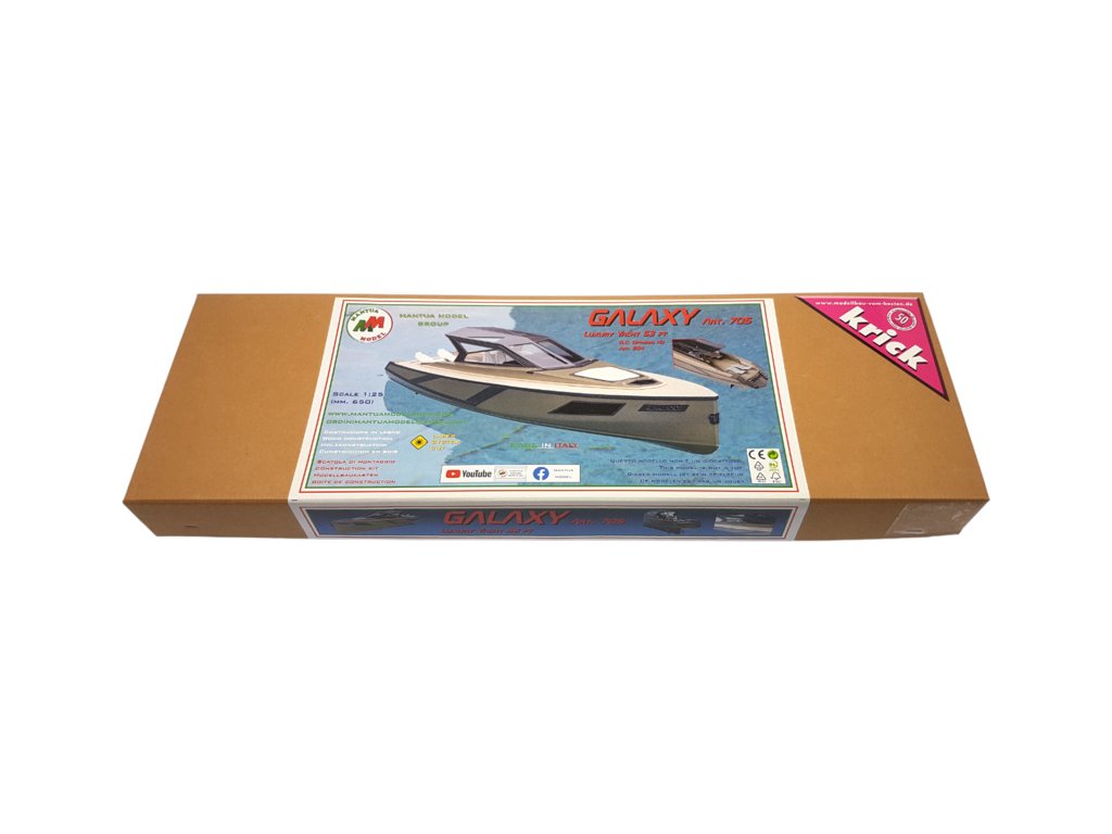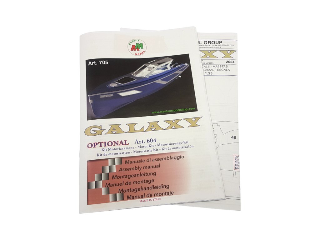 Stavebnice modelu lodi Mantua Model Galaxy 53ft luxusní jachta 1:25. Obsaženy jsou díly pro stavbu modelu jako například - laserem řezaná překližka a další díly pro detailní zpracování, hřídele a dva lodní šrouby. Lze sestavit jako neplovoucí maketu i RC model. Pro sestavení jako plovoucí RC model je k dispozici pohonná sada se dvěma stejnosměrnými motory (sada není obsahem balení). Samostatně je také nutno dokoupit další RC vybavení jako, regulátor, přijímač, vysílač, akumulátor a nabíječ. (Montáž pohonu, případně RC soupravy je určena pro zkušené modeláře, návod se montáží nezabývá.) Podrobný návod s četnými obrázky a stavební plány Vás provedou stavbou jachty.