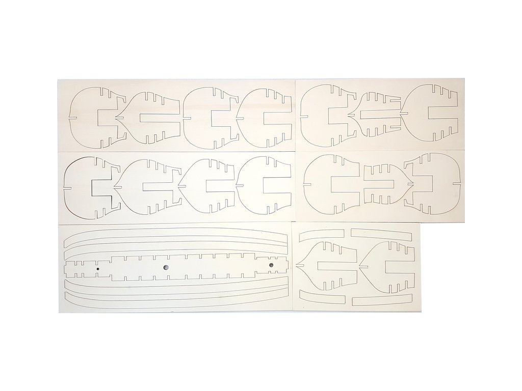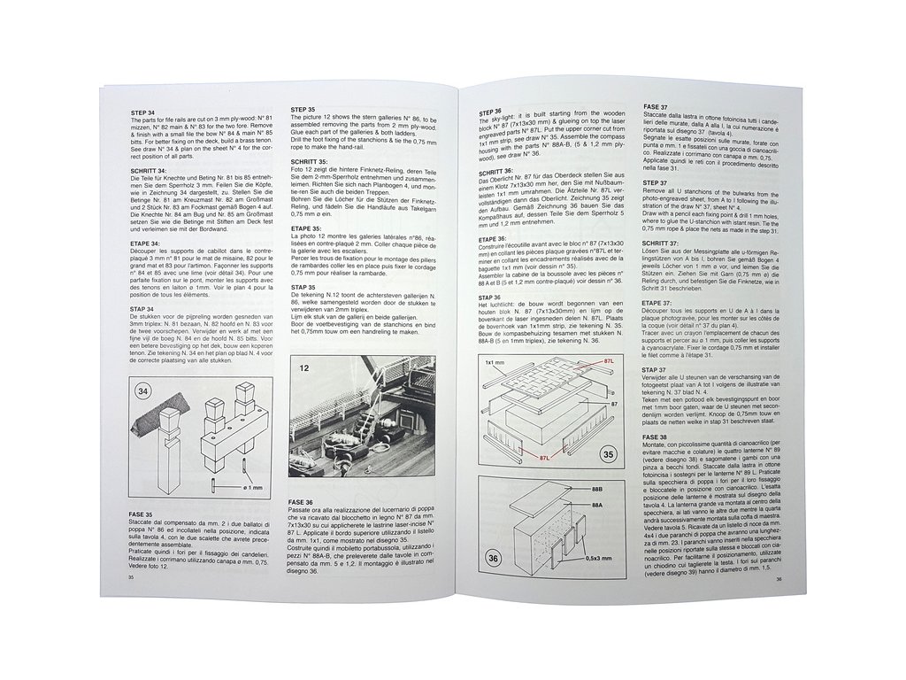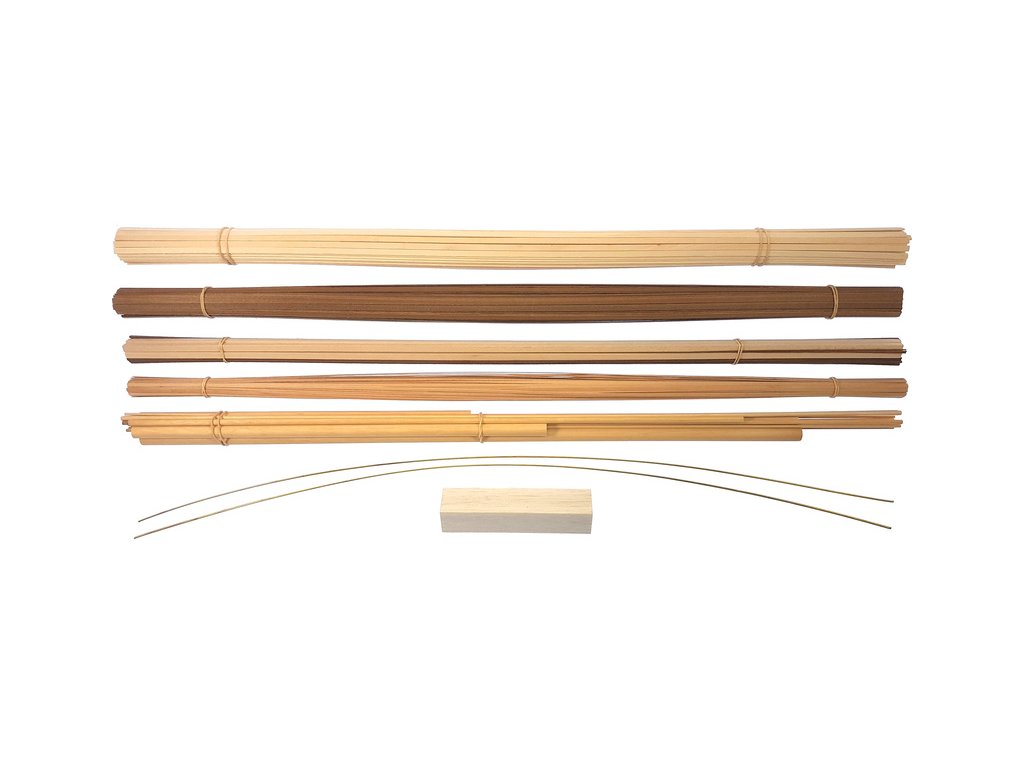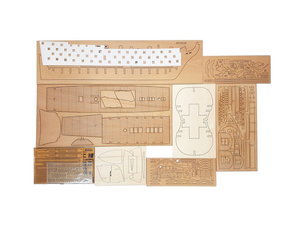 Balení obsahuje sadu překližkových dílů, sadu dřevěných lišt, sáčky s drobnými díly, díly z mosazi, sadu výkresů, český a vícejazyčný manuál.