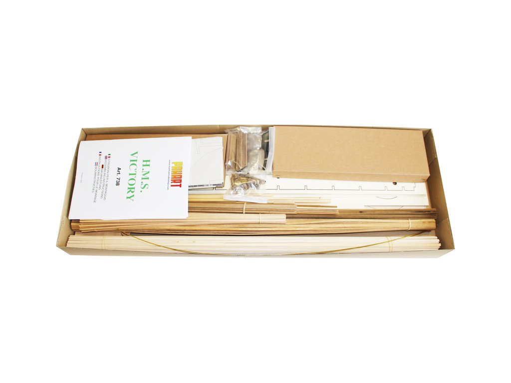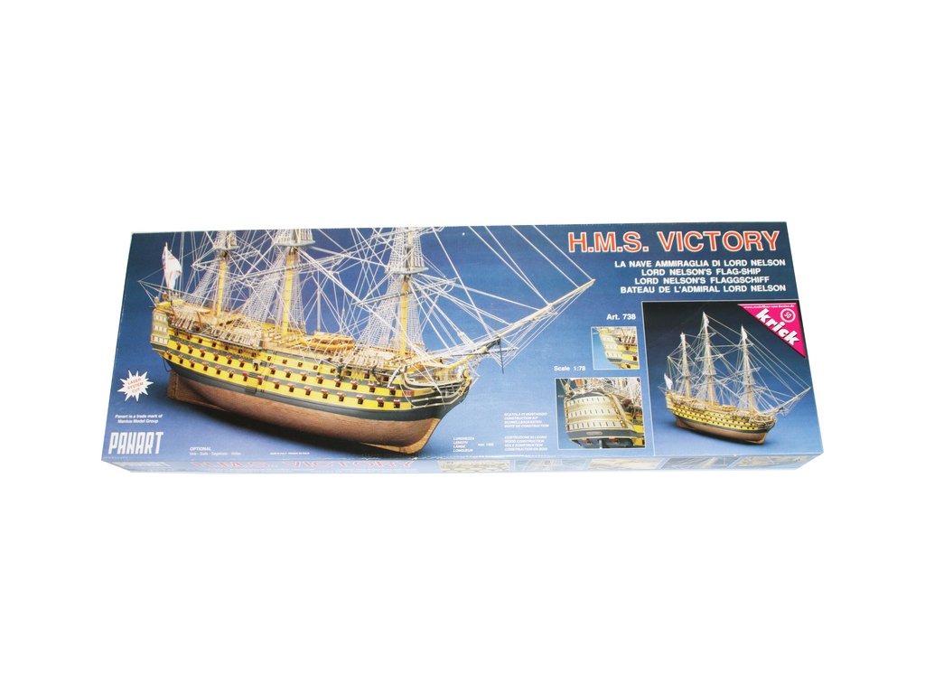Stavebnice velké neplovoucí makety Mantua Model HMS Victory Panart v měřítku 1:78 a délce 1,3m. Skvělý model vlajkové lodi admirála Lorda Nelsona z bitvy u Trafalgaru. obsáhlá stavebnice obsahuje dřevěné díly vyřezané laserem, spoustu maketových detailů, mosazných leptů a kovových odlitků, stavební plány a návod v italštině, angličtině a němčině. Součástí je také stojánek lodi.