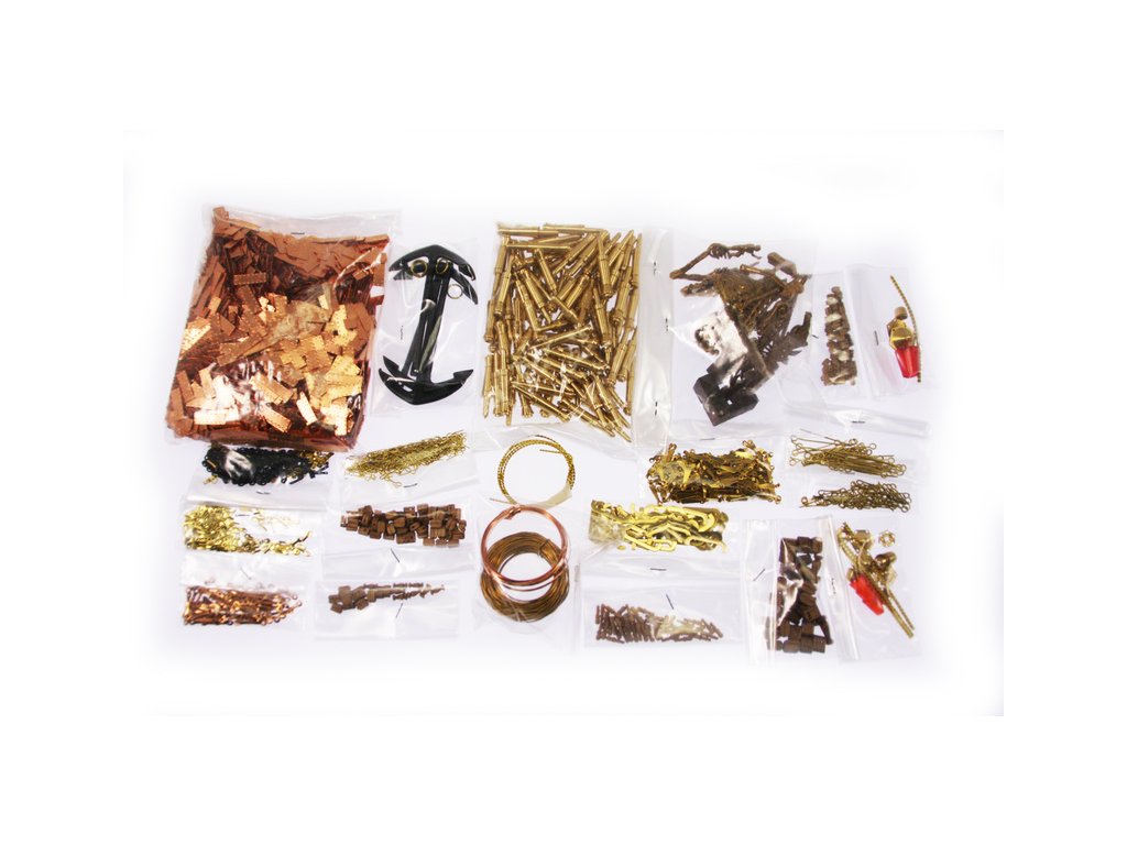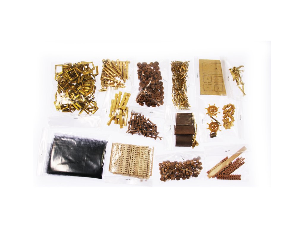 Balení obsahuje sadu překližkových dílů, sadu dřevěných lišt o různém průřezu, blistr s drobnými díly, díly z mosazi, sadu výkresů a vícejazyčný manuál.