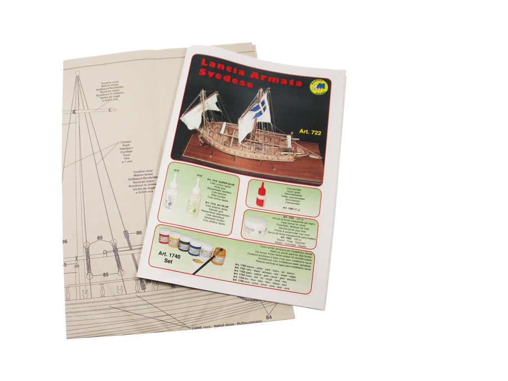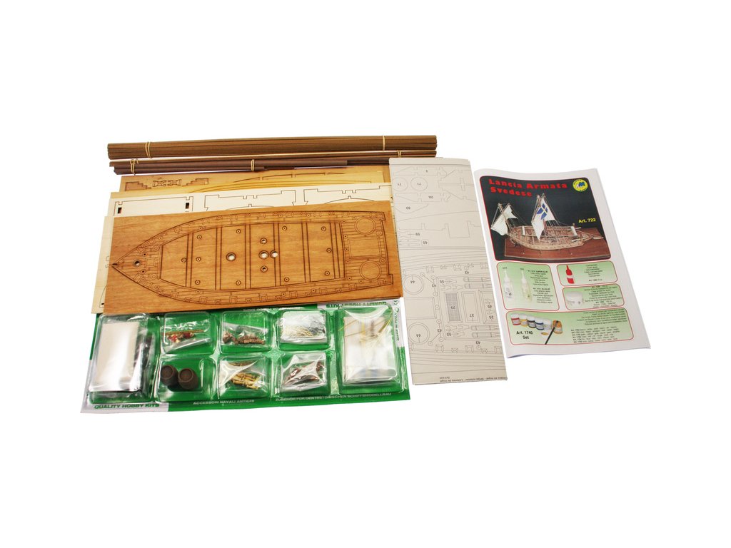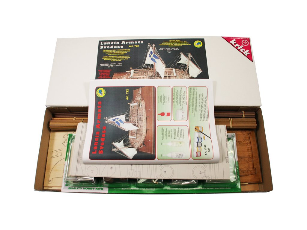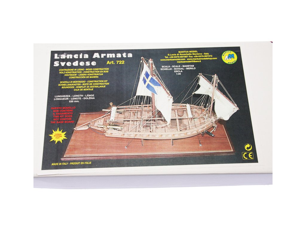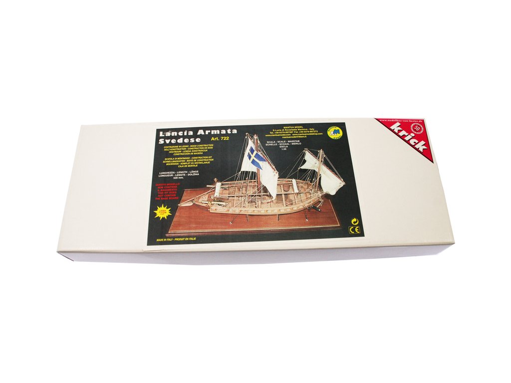 Stavebnice neplovoucího modelu lodi Mantua Lancia Armata Svedese, v měřítku 1:35 a délce 520mm, pro mírně pokročilé modeláře. Stavebnice obsahuje dřevěné díly vyřezané laserem, drobné díly pro dokončení modelu, stavební plány. Součástí je také stojánek lodi.