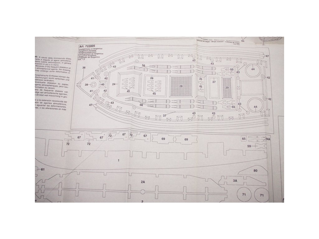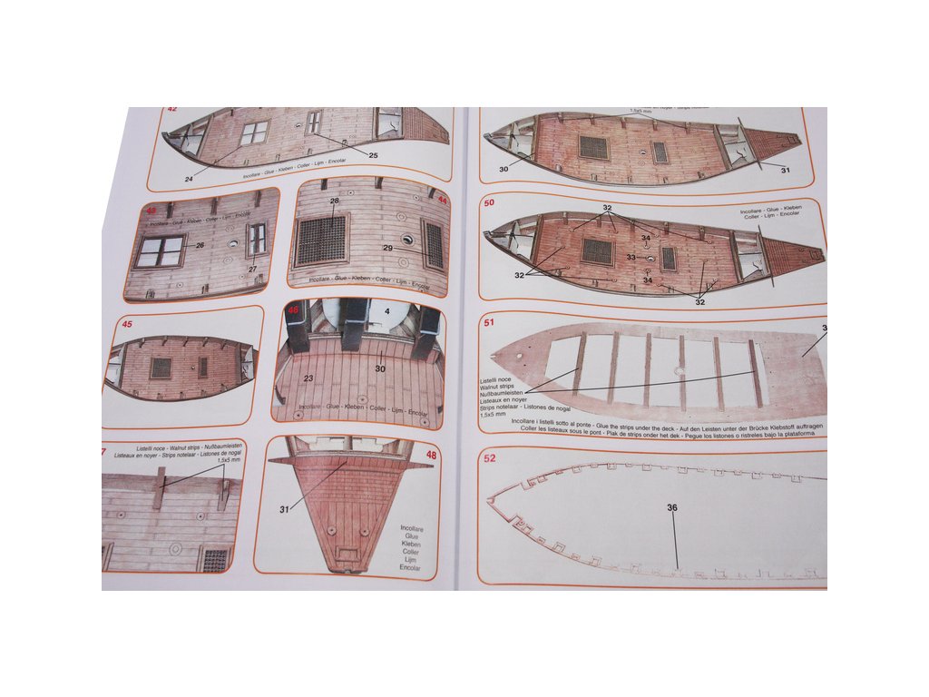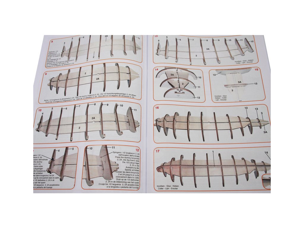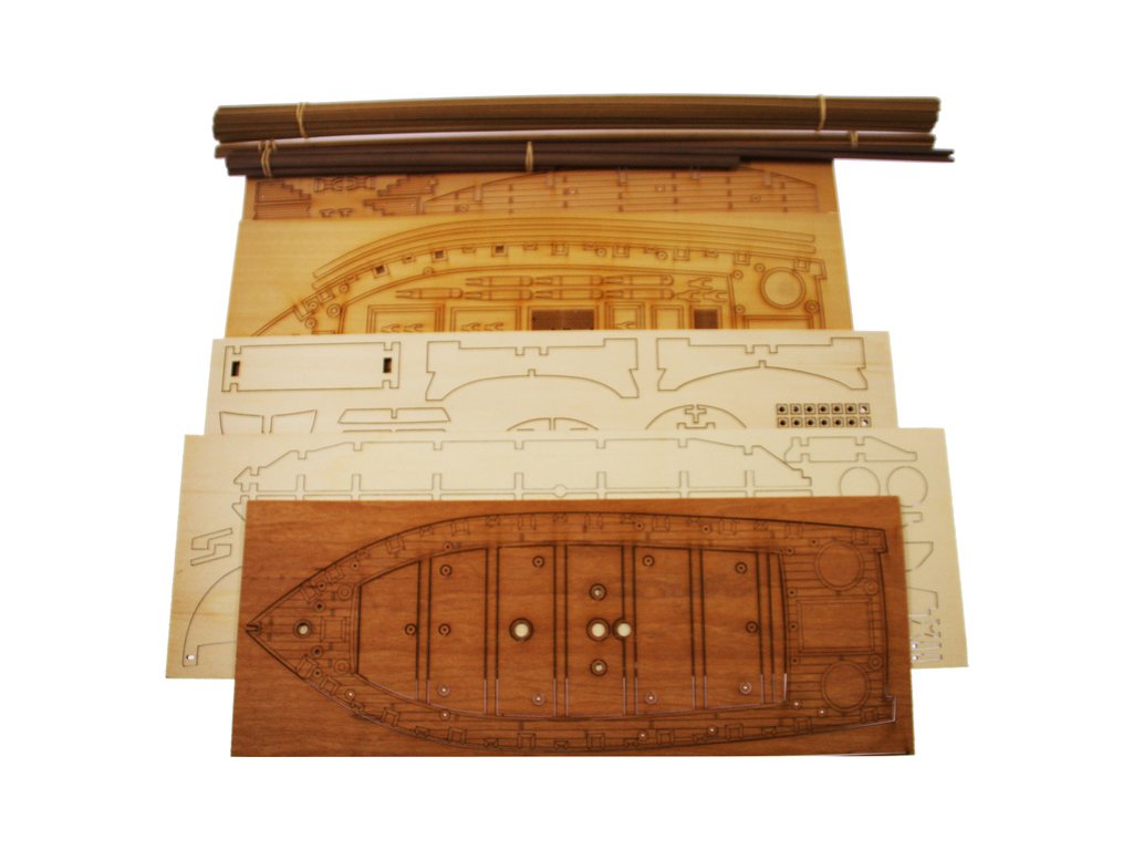 Balení obsahuje sadu překližkových dílů, sadu dřevěných lišt o různém průřezu, drobné díly v blistru, sadu výkresů a vícejazyčný manuál.