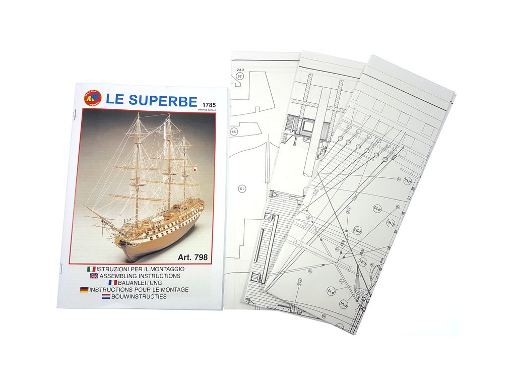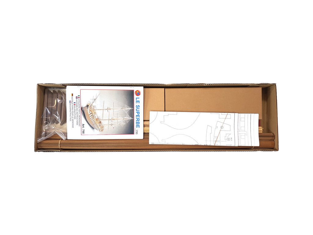 Stavebnice neplovoucího modelu lodi Le Superbe v měřítku 1:75. Krásný zmenšený model slavné francouzské lodi se 74 děly z roku 1784, v detailním provedením a s bohatým zdobením. Délka modelu je 1125 mm. Pro větší odolnost a stabilitu kit obsahuje dvojité plaňkování. Model je koncipován bez plachet, aby vynikly jednotlivé detailu stěžňů. Jako příslušenství lze k modelu dokoupit sadu plachet.