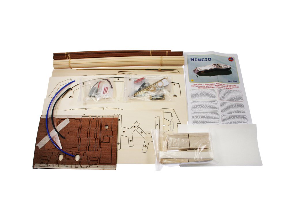 Stavebnice neplovoucího modelu lodi Mantua Model Mincio v měřítku 1:20 pro začínající i pokročilé modeláře. Stavebnice obsahuje dřevěné díly vyřezané laserem, drobné díly pro dokončení modelu, stavební plány a motor s příslušenstvím. Součástí je také stojánek lodi.