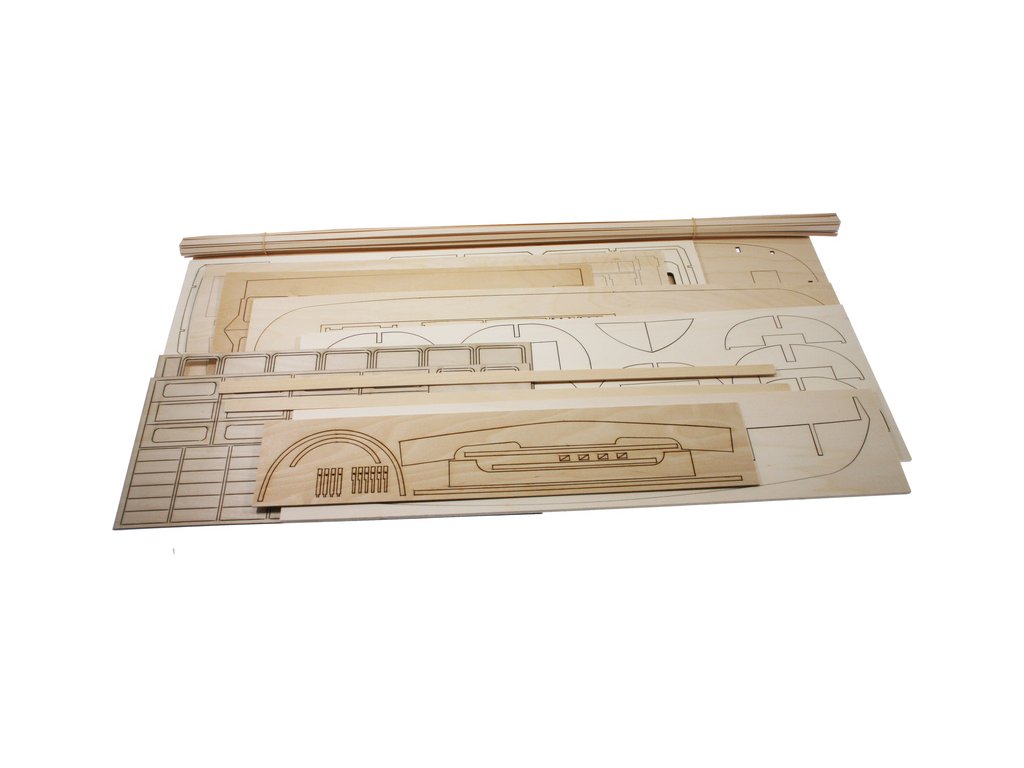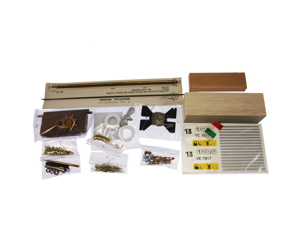 Balení obsahuje sadu překližkových dílů, sadu dřevěných lišt o různém průřezu, sáčky drobnými díly, díly z mosazi, sadu výkresů a vícejazyčný manuál.
