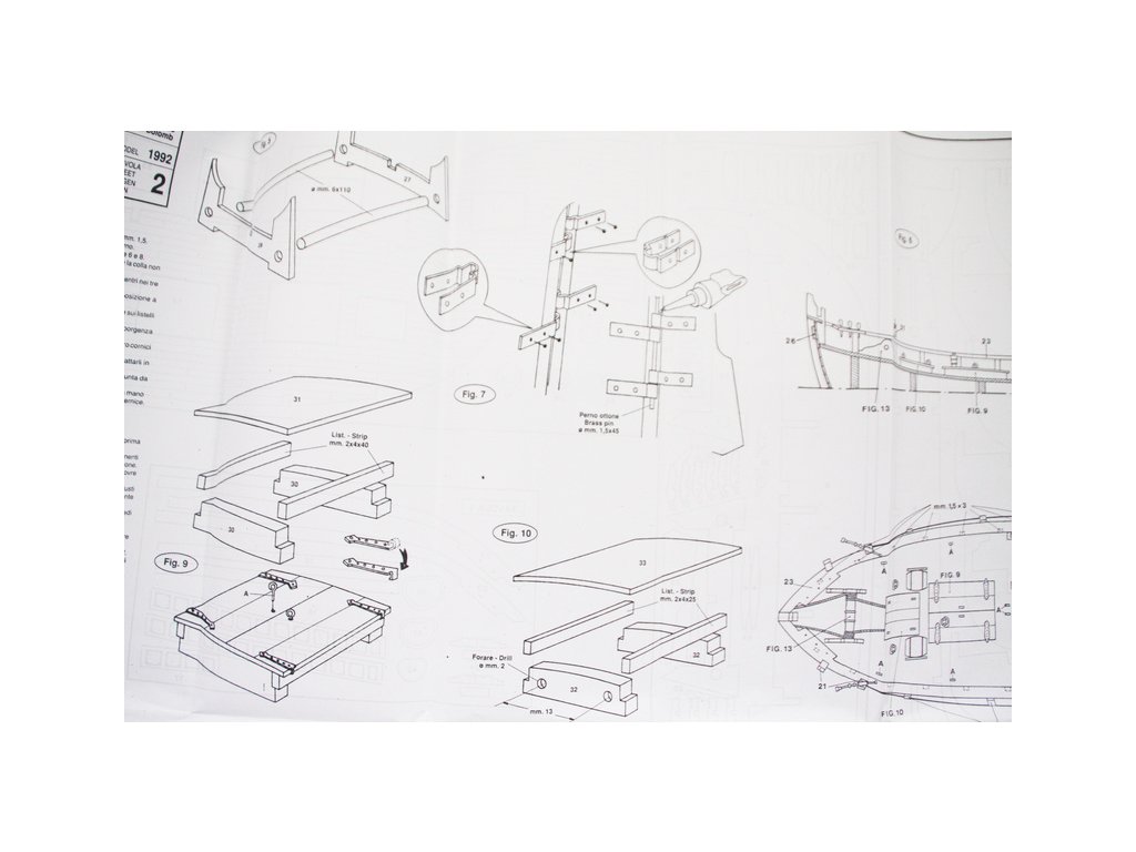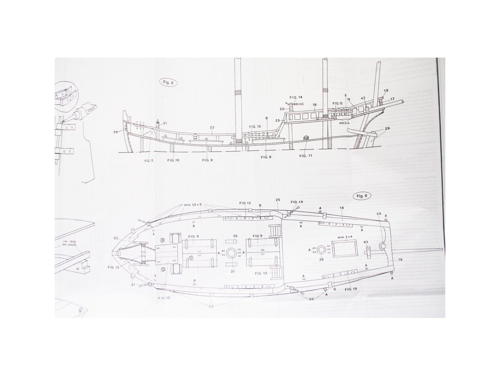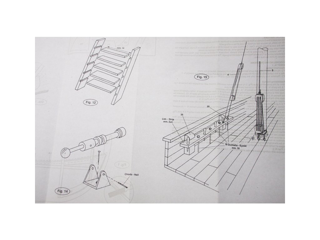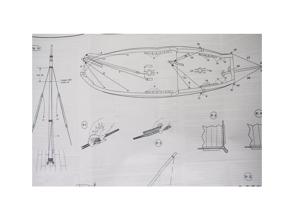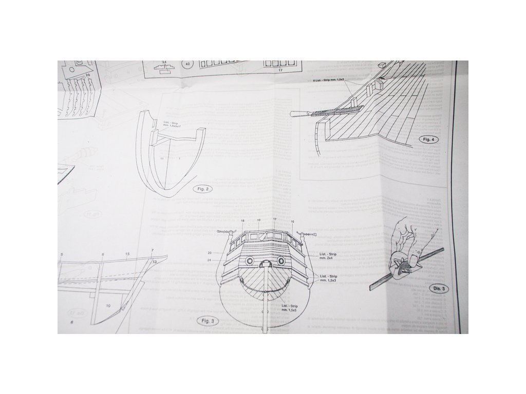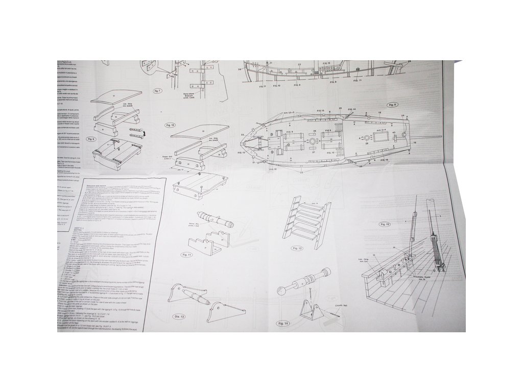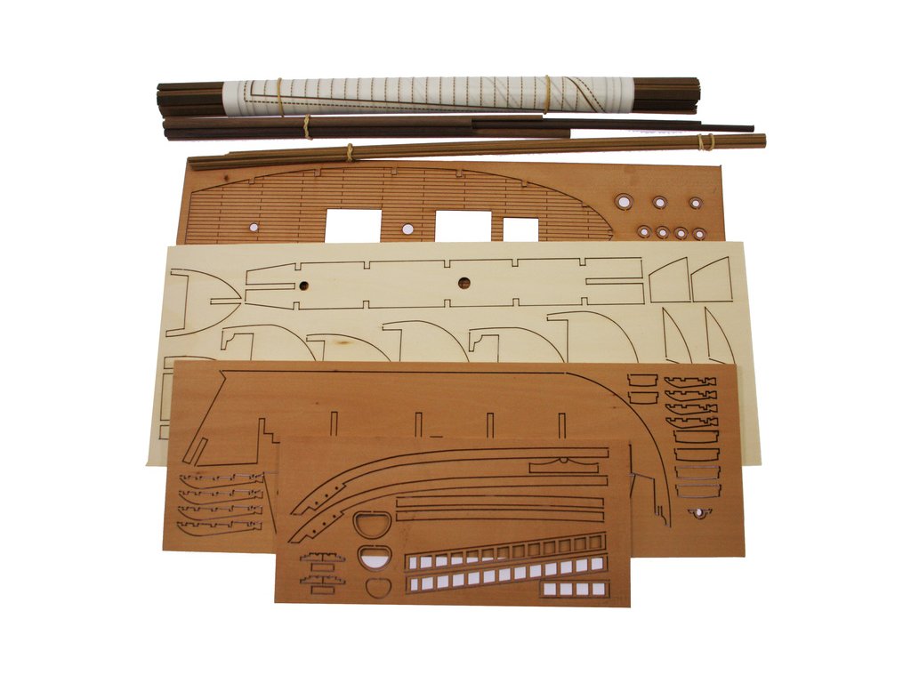 Balení obsahuje laserem řezané dřevěné díly, plaňky, paluby, stožáry, kovové a dřevěné kování, kovové odlitky. Stavební plány, manuál.