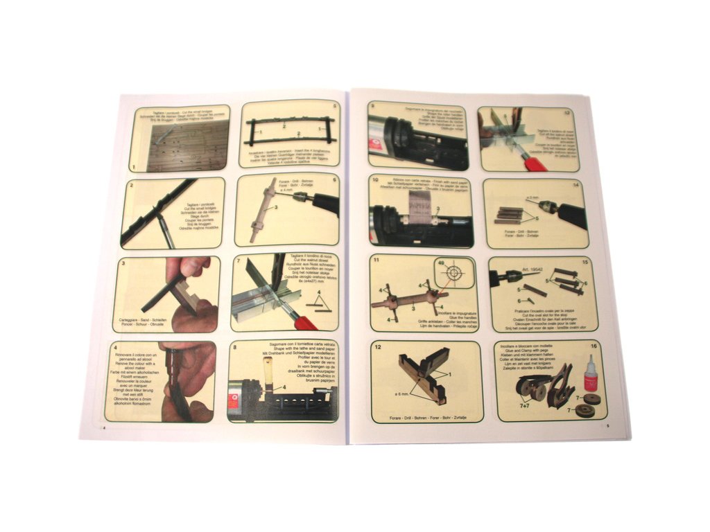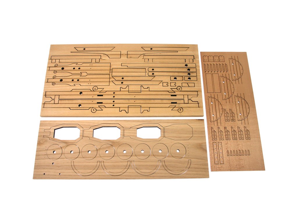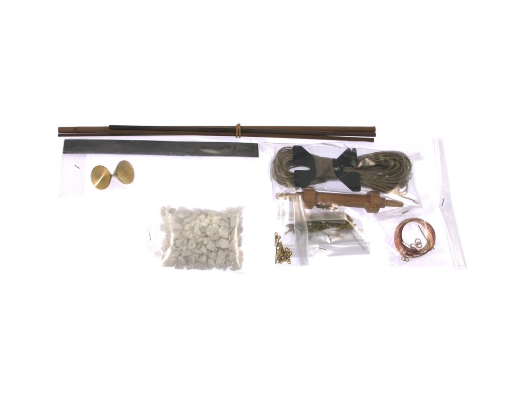 Balení obsahuje laserem vyřezávané dřevěné díly, kovové odlitky, lana, obrázkový vícejazyčný návod ke stavbě.