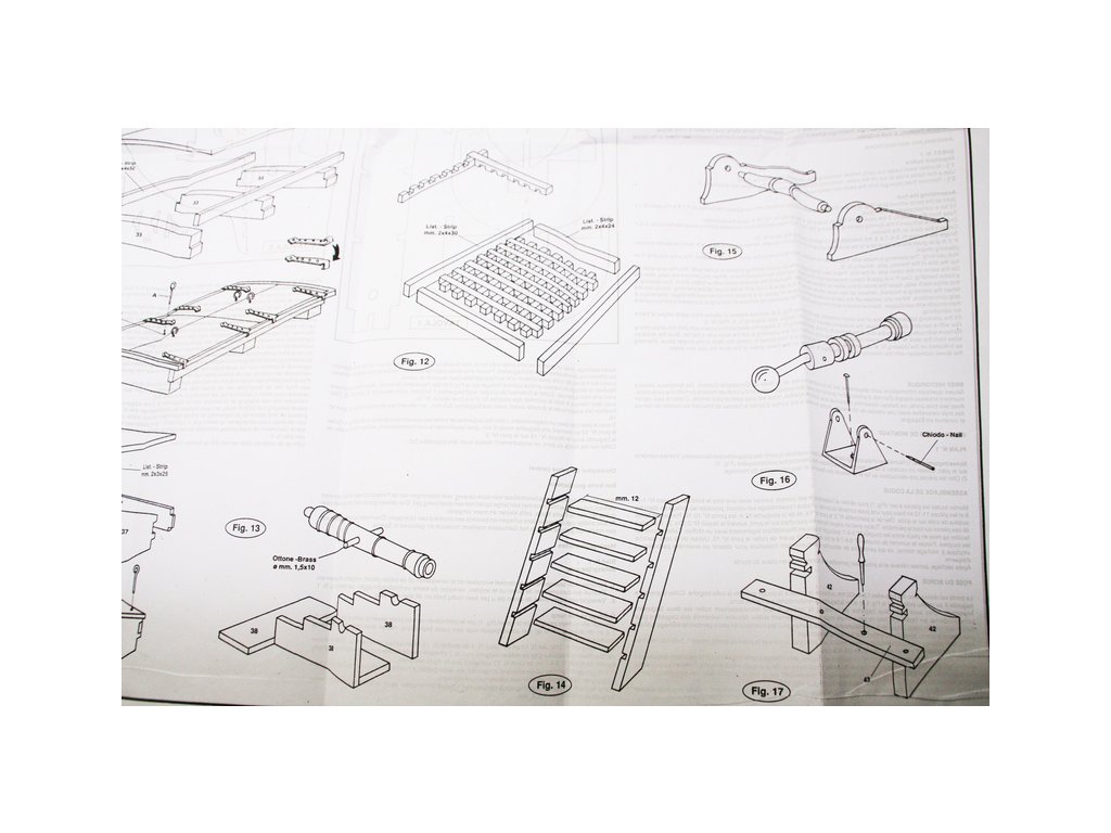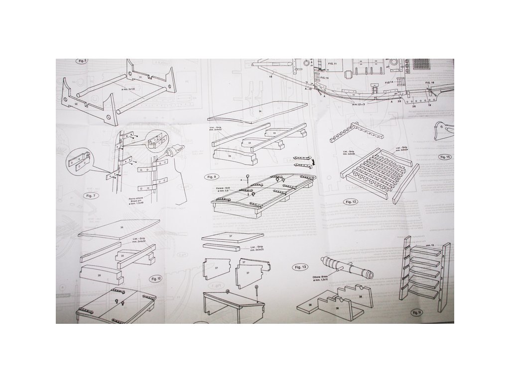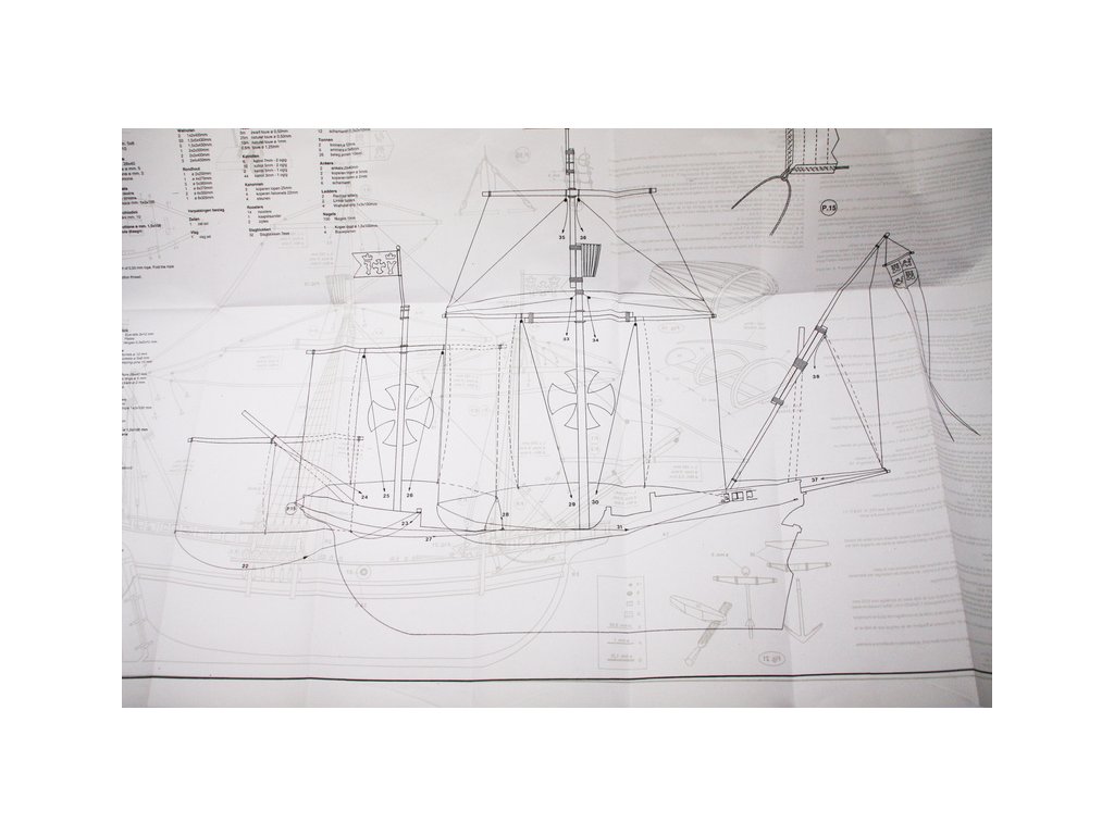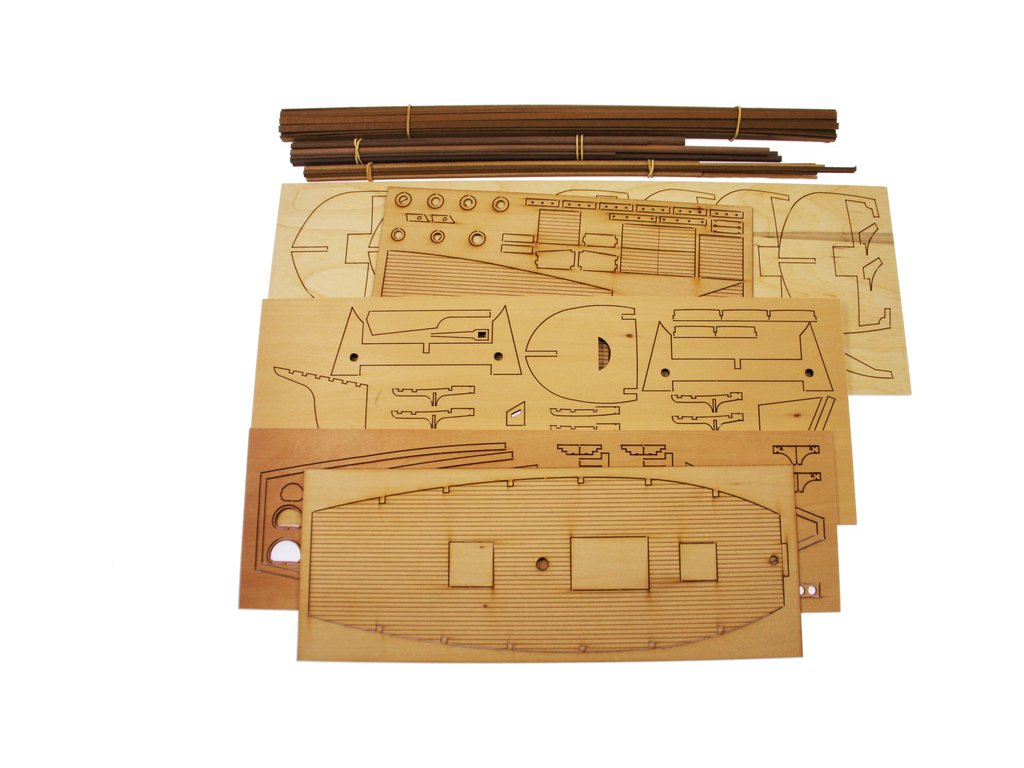 Balení obsahuje laserem řezané dřevěné díly, plaňky, paluby, stožáry, kovové a dřevěné kování, kovové odlitky. Stavební plány, vícejazyčný návod.