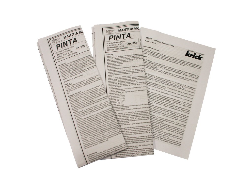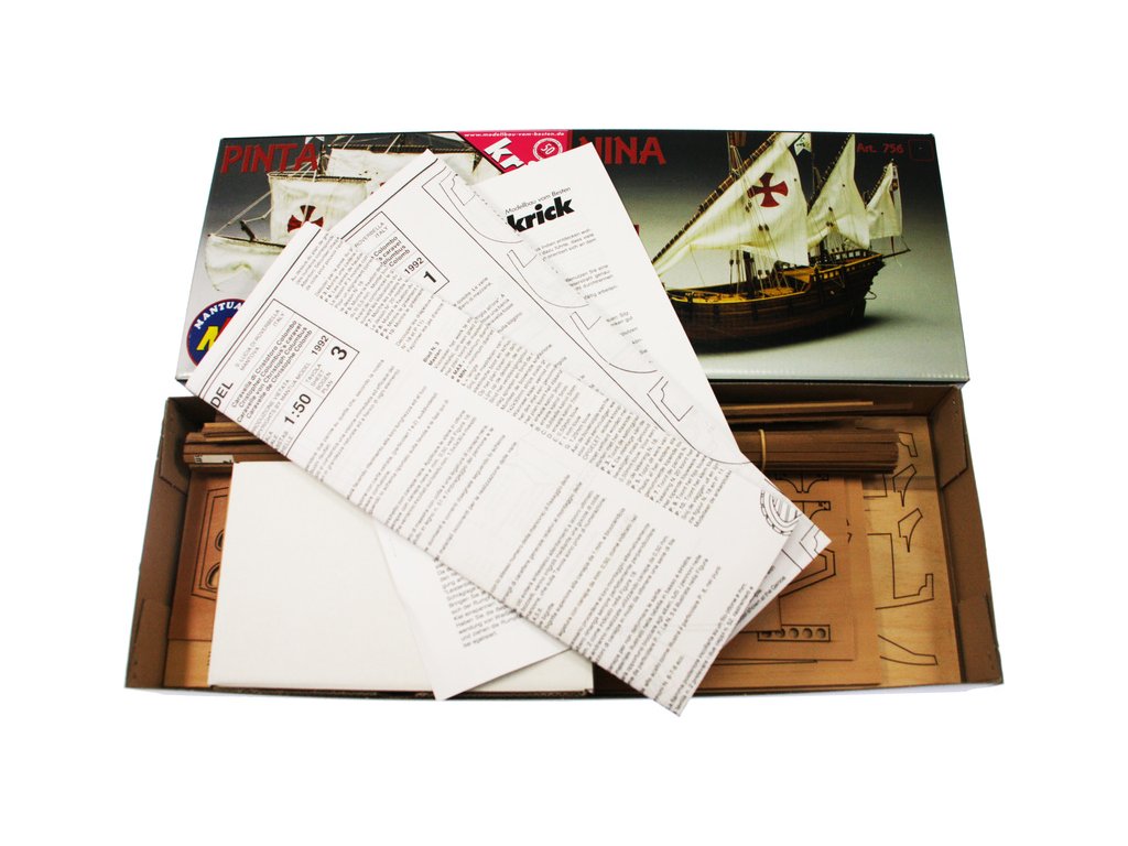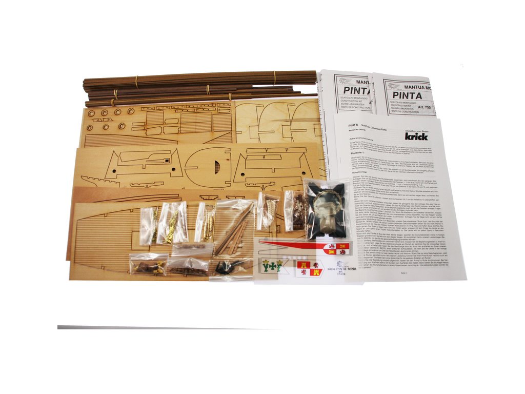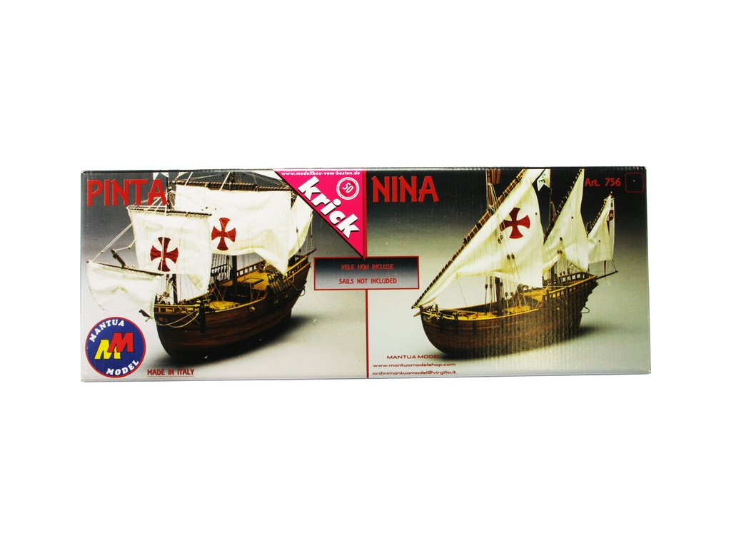Stavebnice neplovoucího modelu známé plachetnice Mantua Model Pinta v měřítku 1:50 a délce 540mm. Spolu s lodí Nina a Santa Maria tvořila flotilu Kryštofa Kolumba, se kterou v roce 1492 objevil nový svět. Kit obsahuje dřevěné díly, kovové odlitky dekorací a podrobné stavení plány.
