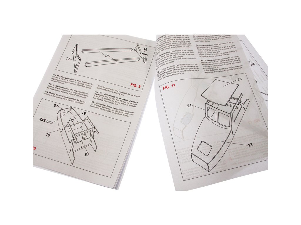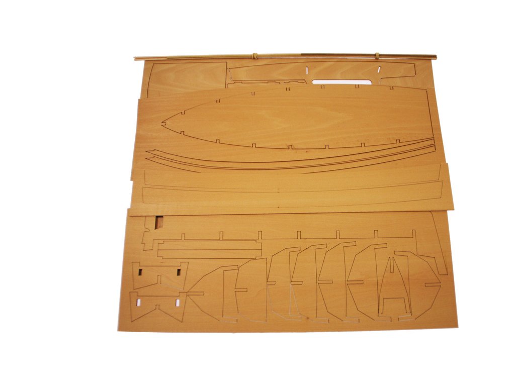 Balení obsahuje sadu překližkových dílů, dřevěné díly, drobné díly pro dokončení modelu, stavební plány, návod s výkresy a vícejazyčný manuál.