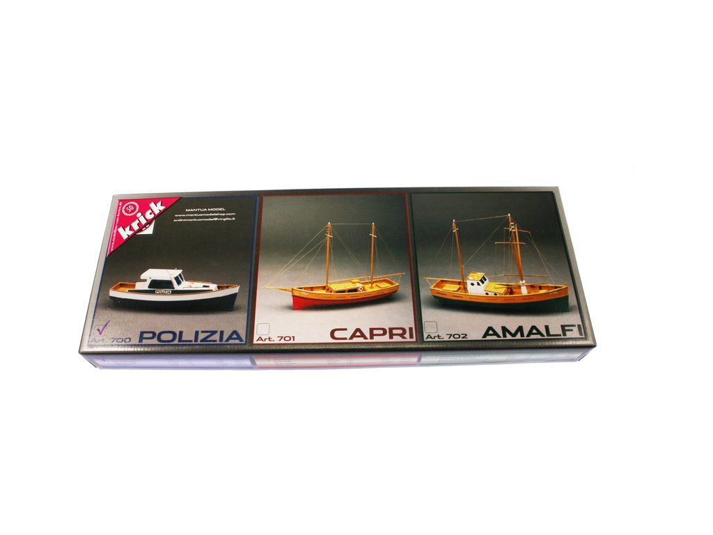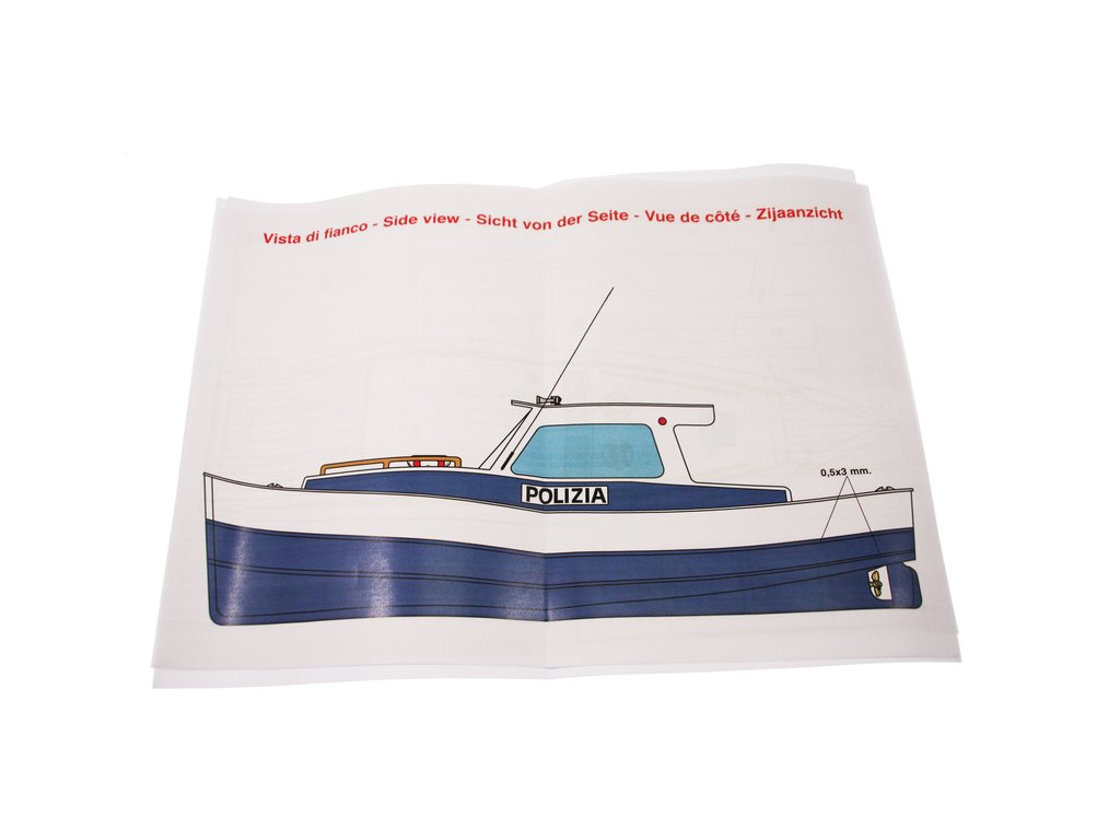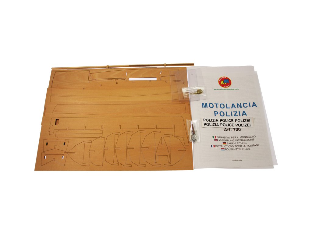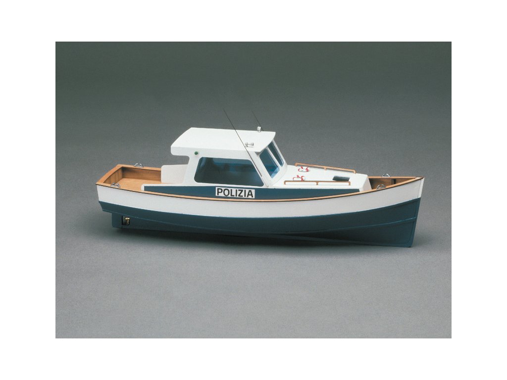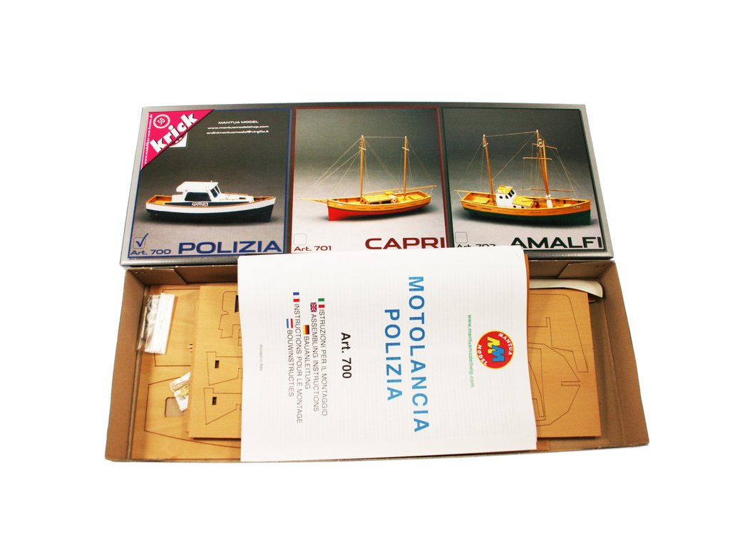 Stavebnice neplovoucího dřevěného modelu lodi, Mantua Model Policejní člun v měřítku 1:35 a délce 400mm. Malý motorový člun v designu italských lodí přístavní policie. Je ideálním pro začínající modeláře, kteří se chtějí zabývat stavbou modelů lodí z dřevěných stavebnic. Stavebnice je plně vybavena přesně lícujícími dřevěnými díly vyřezanými laserem, drobnými díly pro dokončení modelu, stavebních plánů a návodem s výkresy řezů. Součástí je také stojánek lodi.