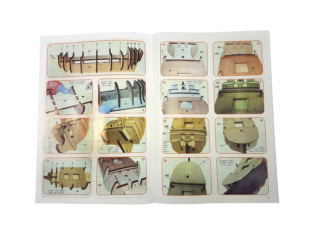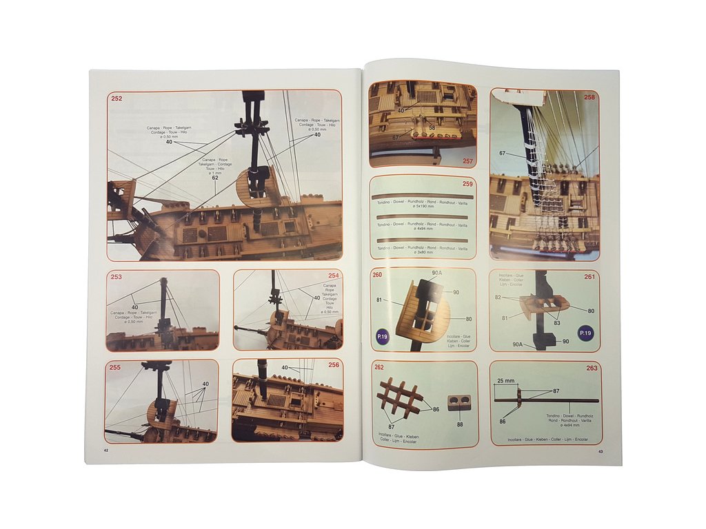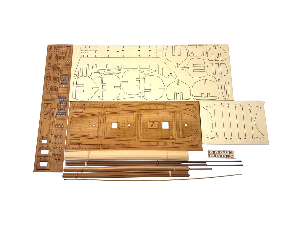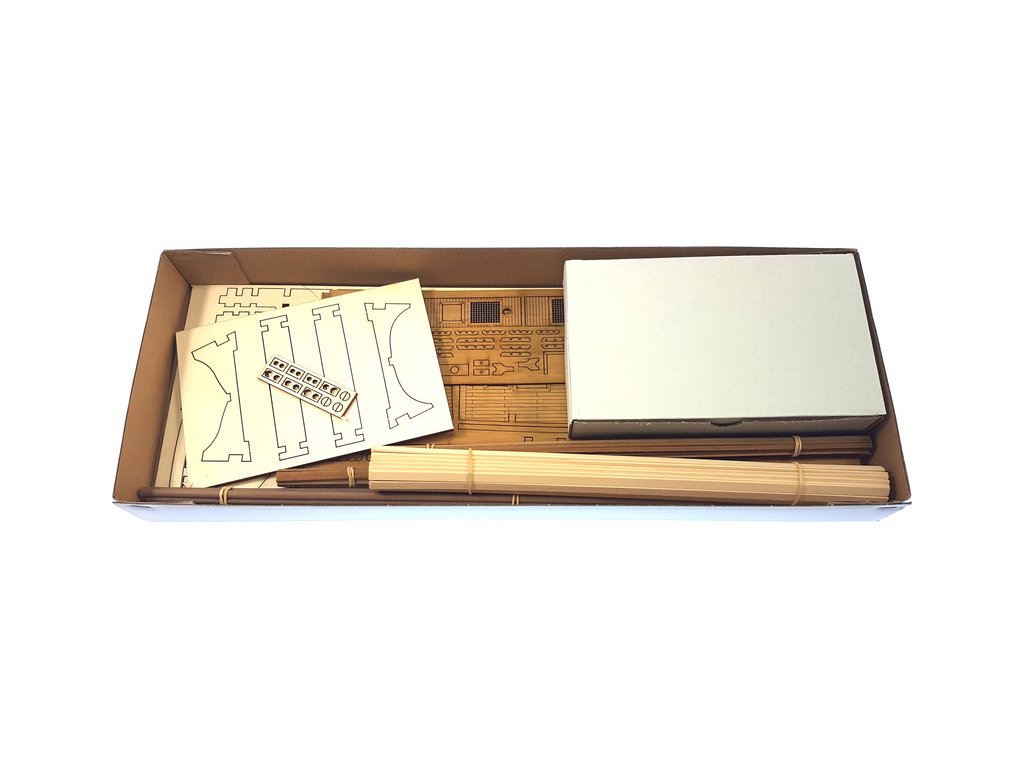 Balení obsahuje laserem řezané dřevěné díly, plaňky, stožáry, vlajku, lanoví a dekorace z mosazných odlitků. Stavební pokyny EN, DE, IT.