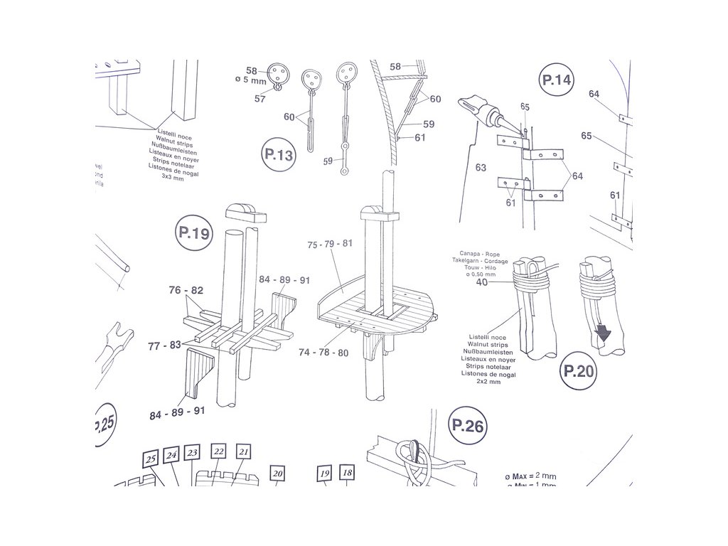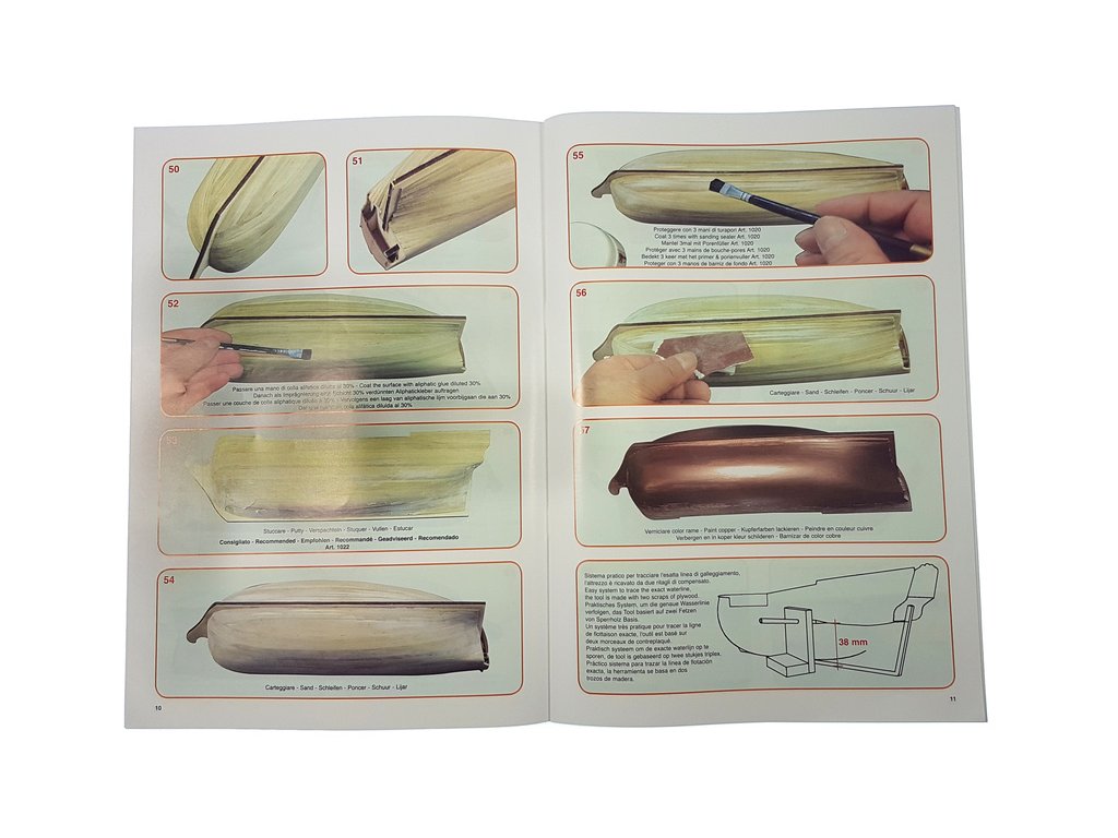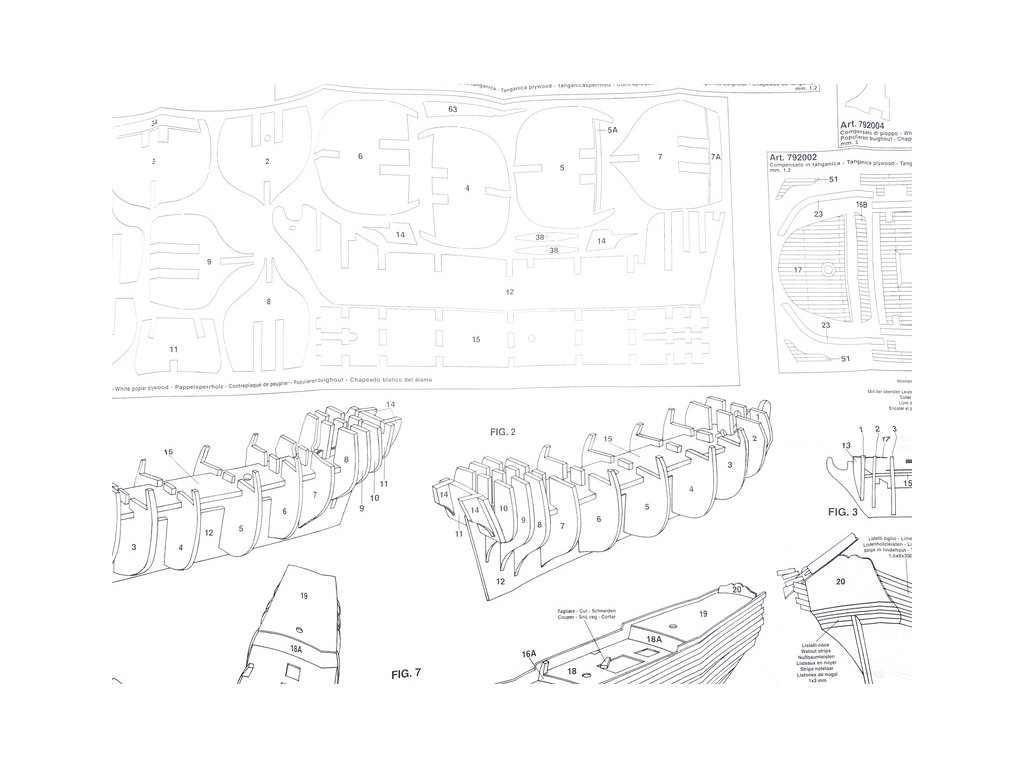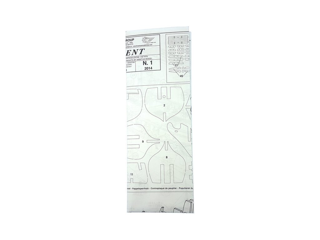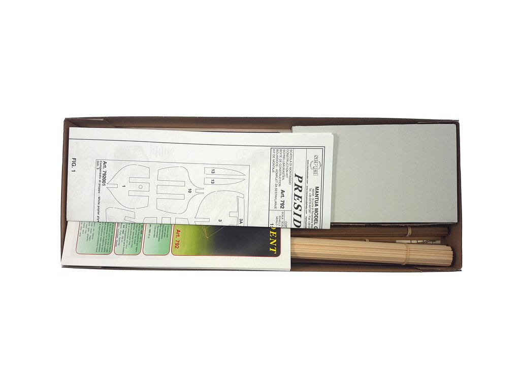 Balení obsahuje laserem řezané dřevěné díly, plaňky, stožáry, vlajku, lanoví a dekorace z mosazných odlitků. Stavební pokyny EN, DE, IT.