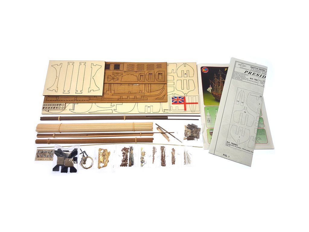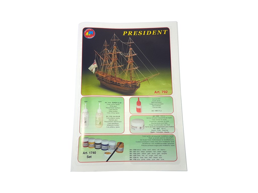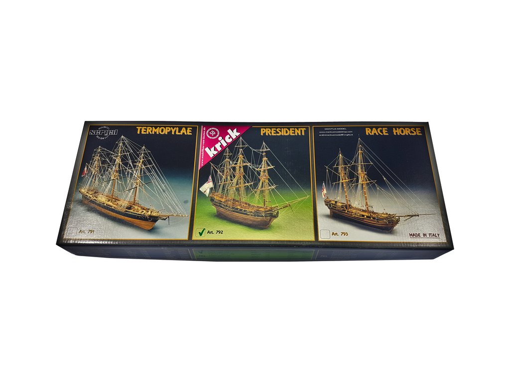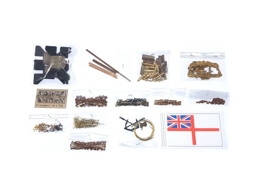 Stavebnice neplovoucího modelu lodi President v měřítku 1:60. Model anglické fregaty z 18. století, která byla velmi rychlá a dobře ovladatelná. Stavebnice obsahuje přesné laserem řezané dřevěné díly, dojité plaňkování a mosazné odlitky jako dekorace. Délka: 52cm.