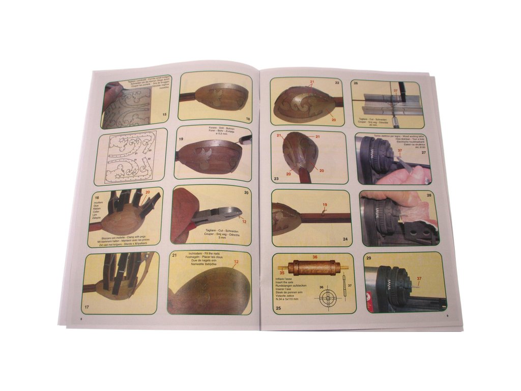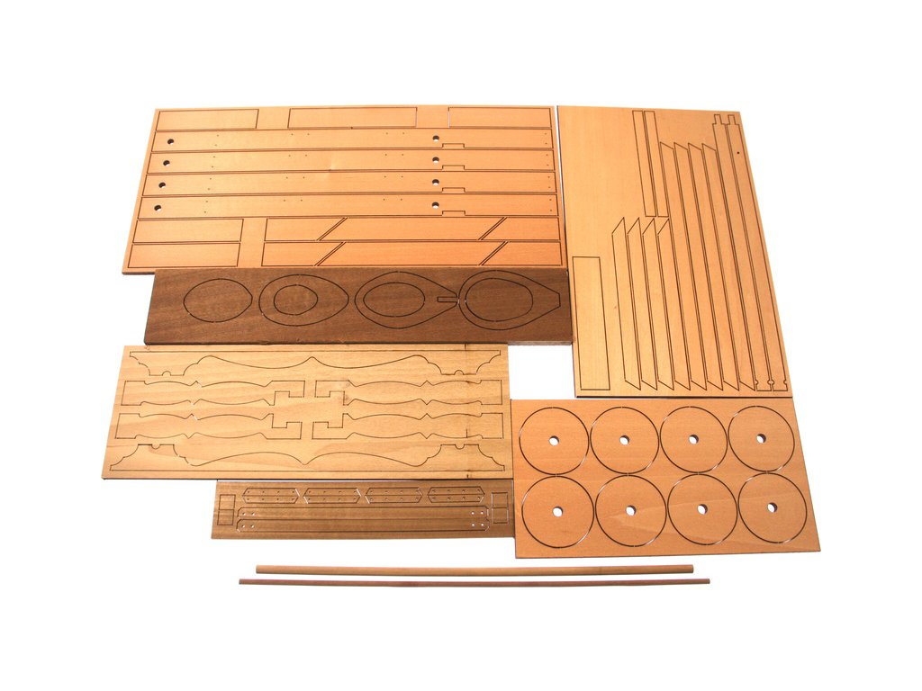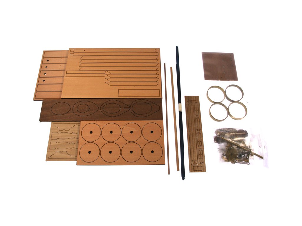 Balení obsahuje laserem vyřezávané dřevěné díly, kovové odlitky, lana, detailní obrázkový návod ke stavbě.