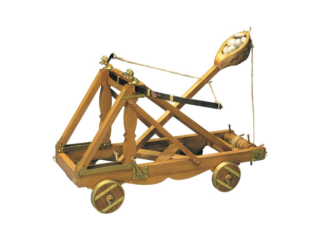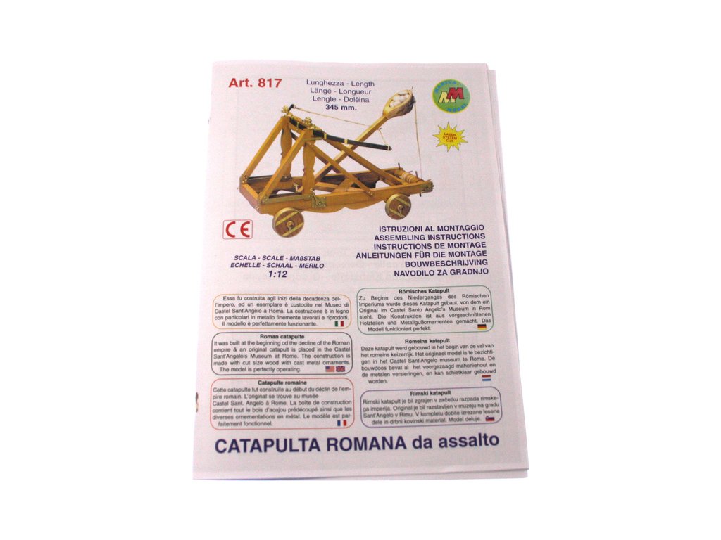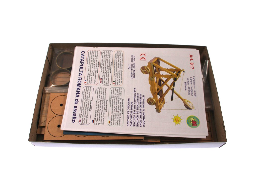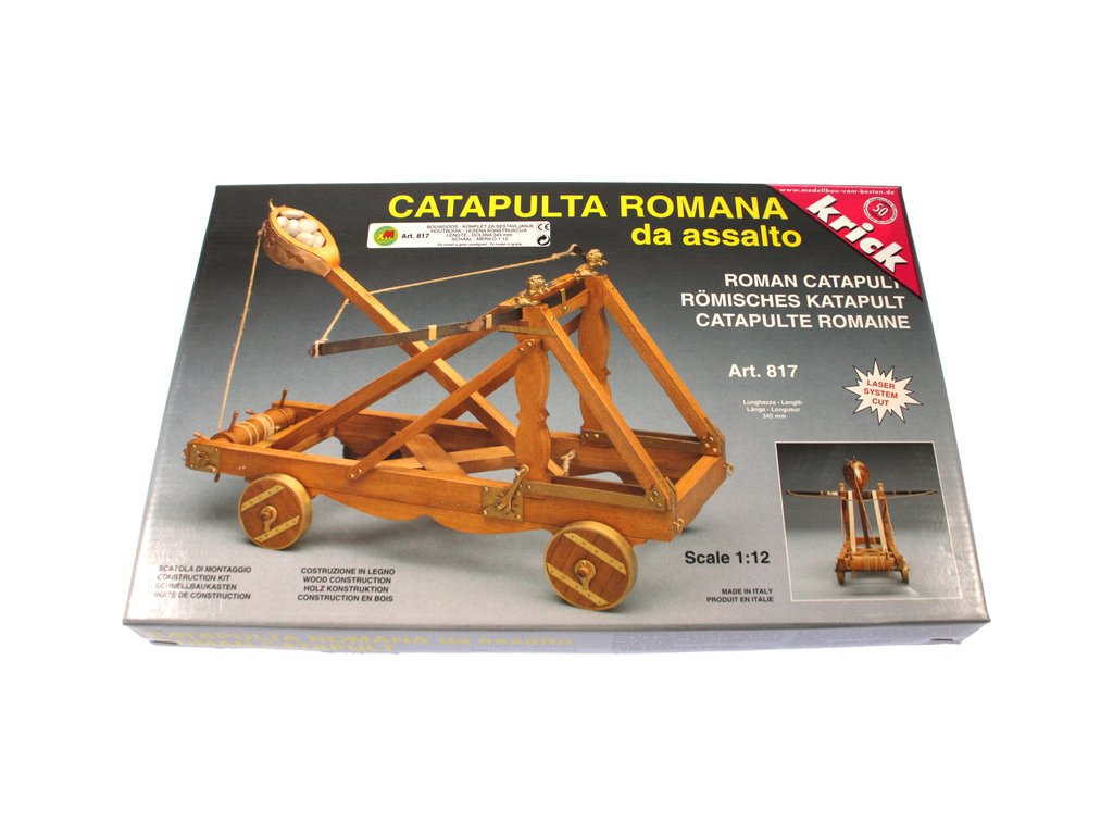 Stavebnice modelu Římského katapultu v měřítku 1:12. Konstrukce se skládá z předem nařezaných dřevěných dílů a kovových litých ozdob. Předloha katapultu pochází z 1. století našeho letopočtu. Originál katapultu je umístěn v muzeu "Castel Santo Angelos" v Římě. Zbraň používala jednoduché odpalovací rameno na principu luku. Tento systém byl velmi účinný při obléhání pevností, ničení opevnění měst apod. Jako projektil se používaly kameny nebo celé kamenné koule. Pomocí katapultů se také někdy vrhali padlí vojáci a koně, kteří měli rozšířit infekce v oblehaném místě.